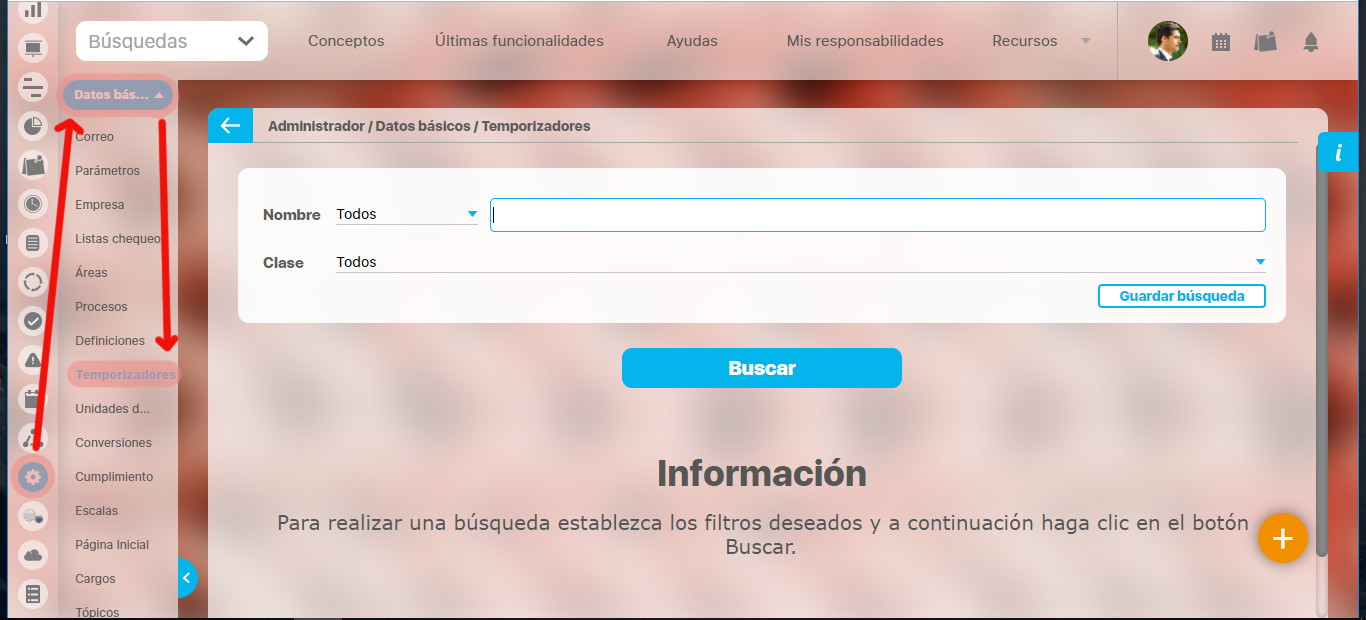 Selecciona la opción "Temporizador" del menú lateral Información Básica, aparece la siguiente pantalla donde encuentra los diferentes criterios de búsqueda.