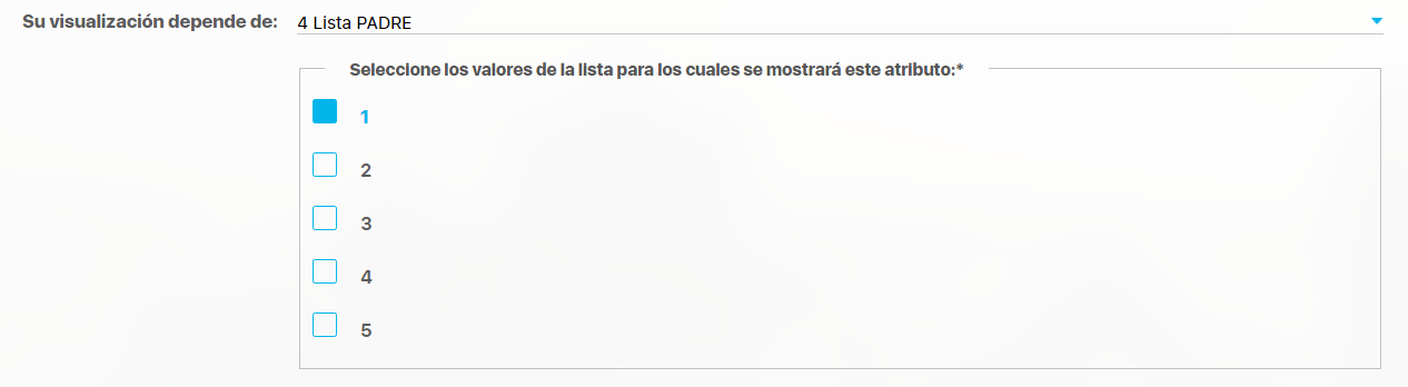 Ejemplo, el atributo subordinado sólo será visible cuando la opción elegida en el atributo superior denominado 4 Lista Padre sea 1.
