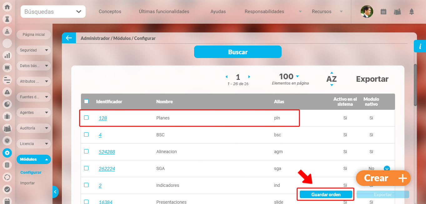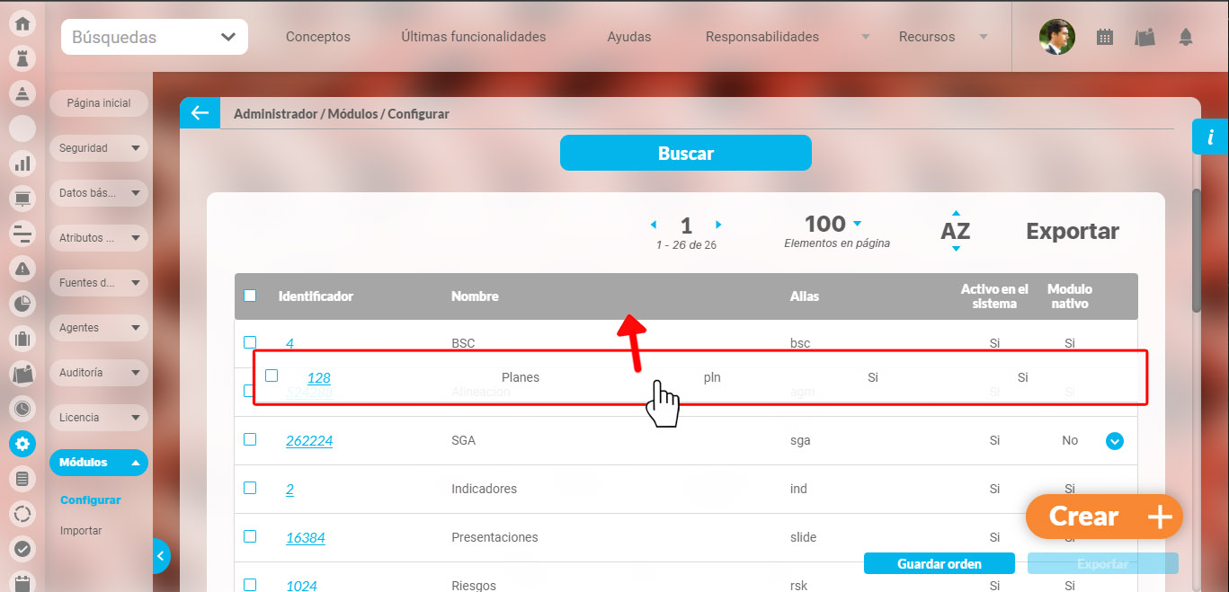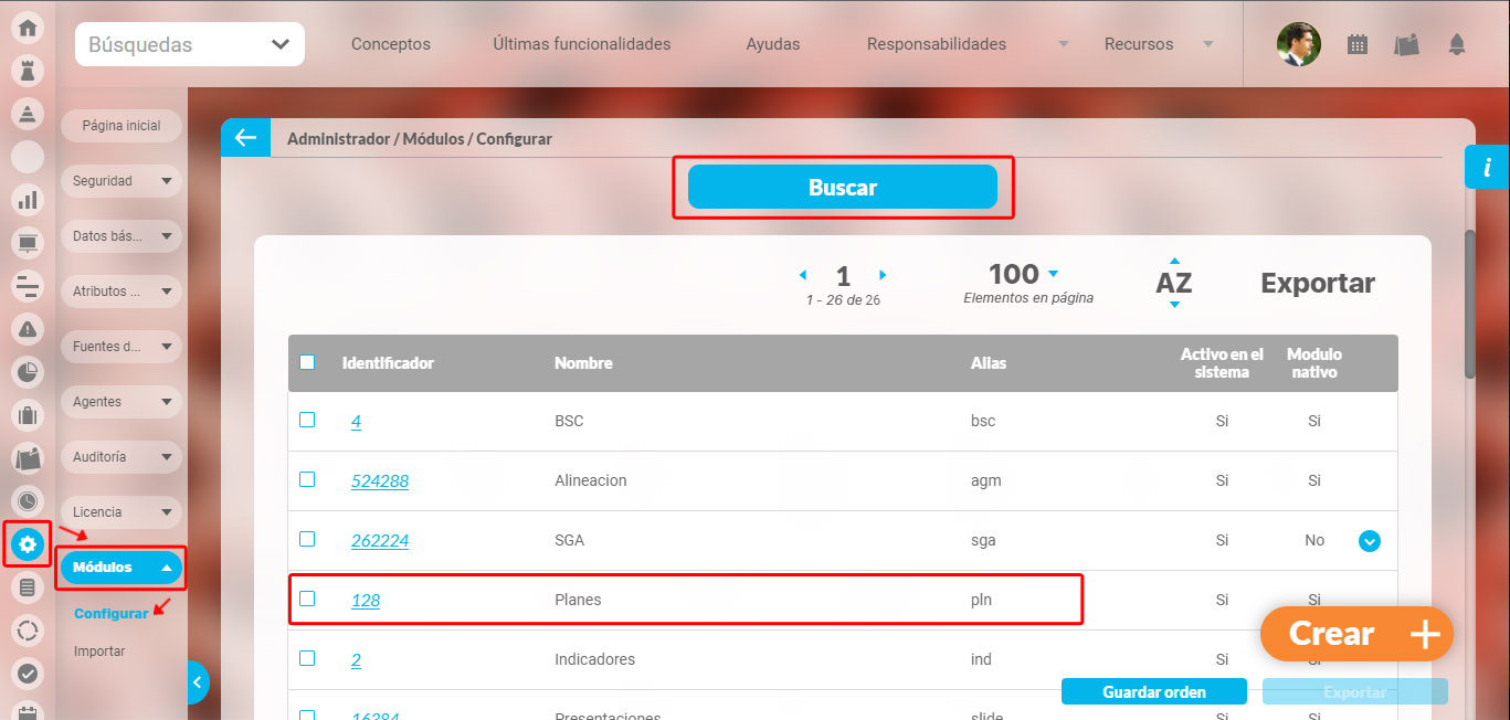 Elija la opción Módulos del menú lateral y elija la opción Configurar, luego realiza la búsqueda sin modificar los filtros para traer todos los módulos del sistema.