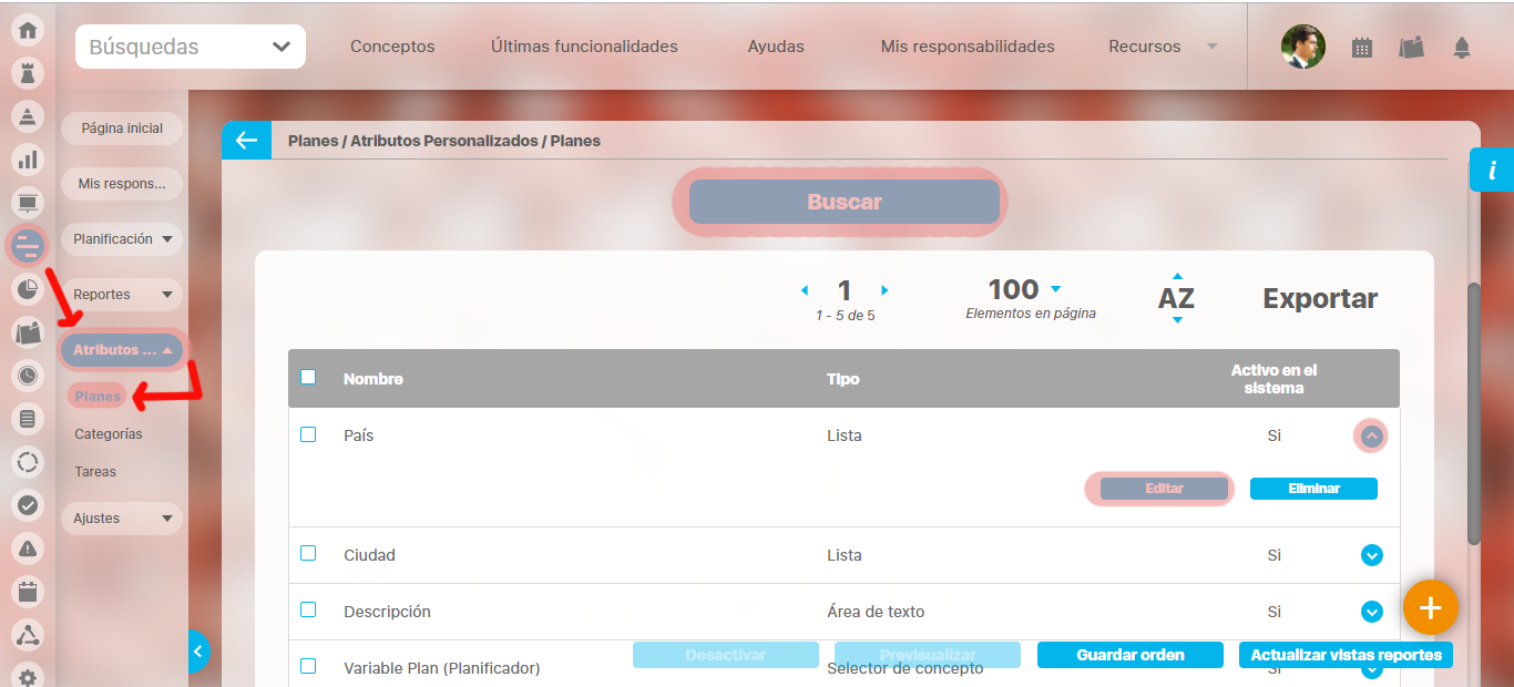 En la tabla de resultados del buscador de Atributos, haga clic sobre el atributo que desea modificar y elija la opción Editar del menú emergente.
