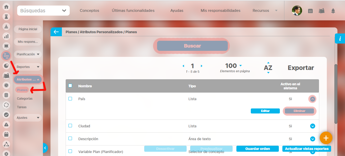 En la tabla de resultados del buscador de Atributos, haga clic sobre el atributo que desea eliminar y elija la opción Eliminar del menú emergente.