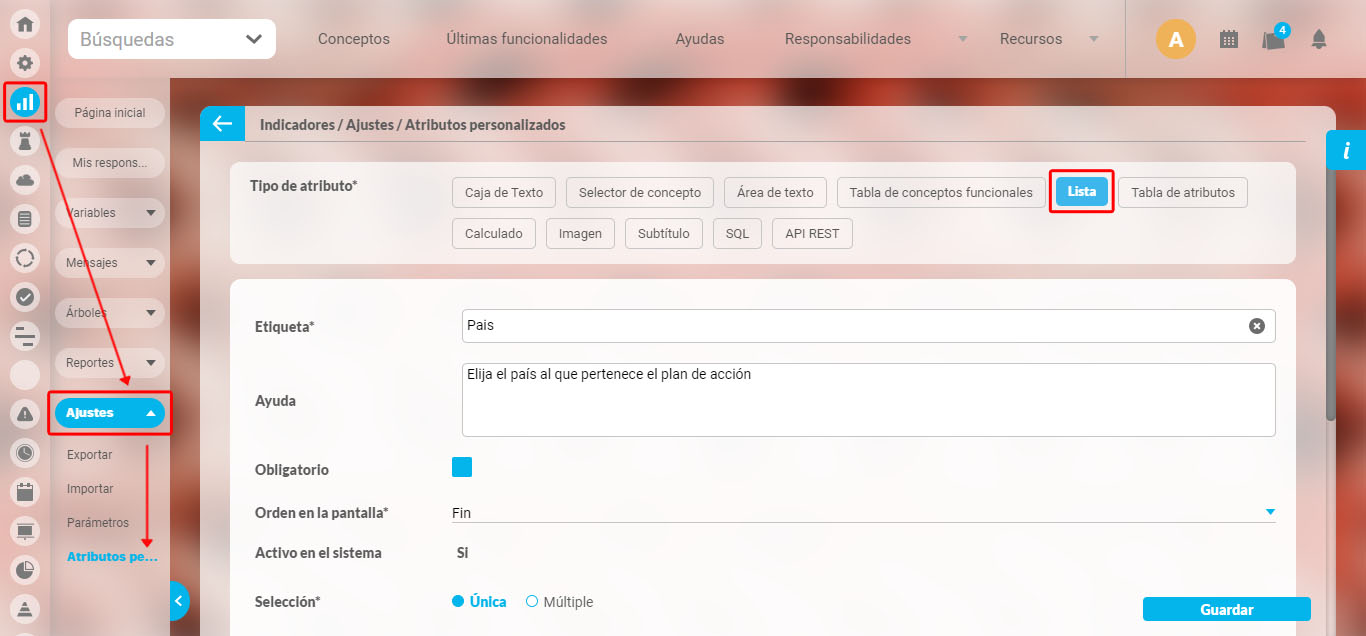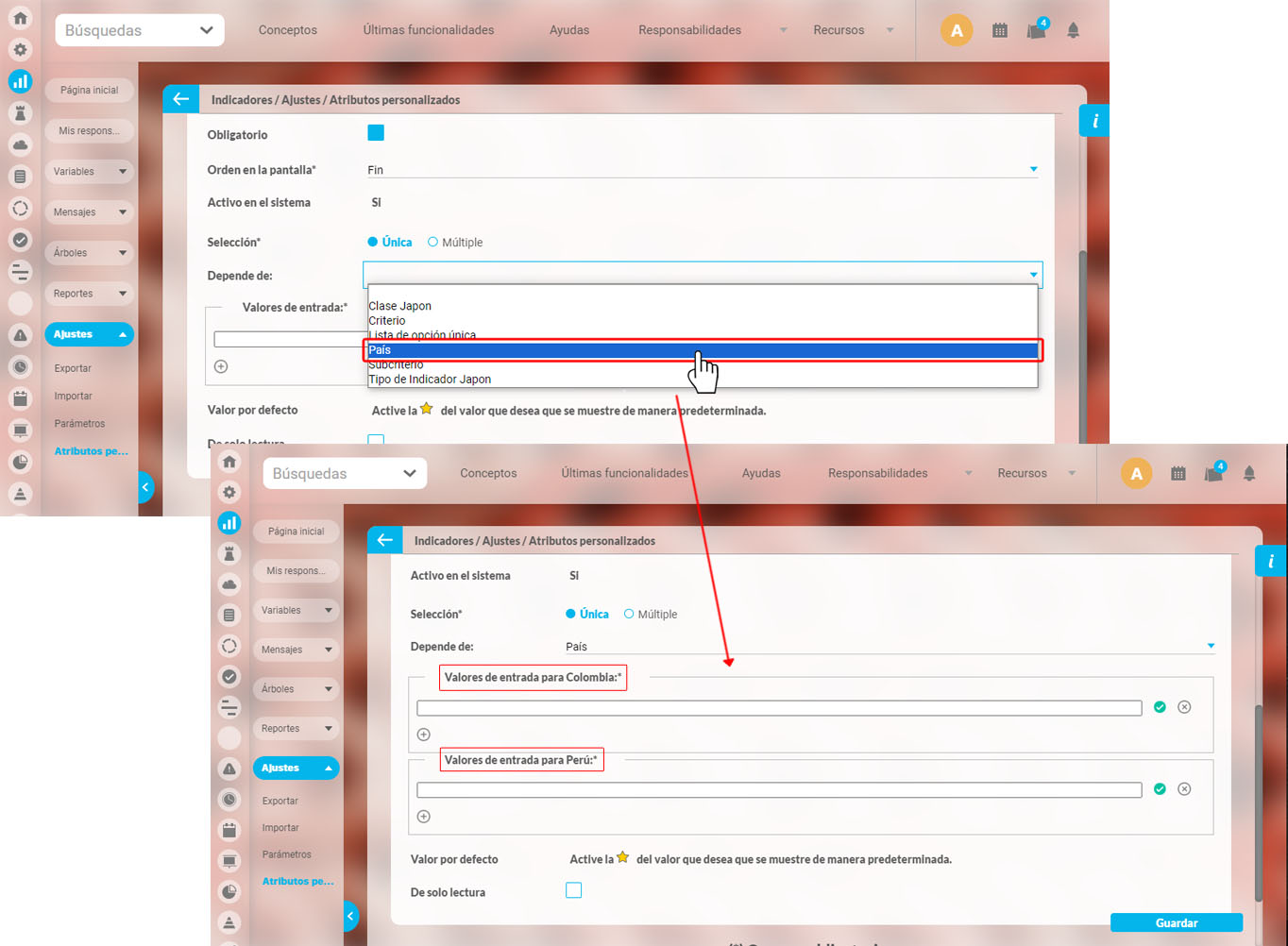 Previamente se debe haber configurado el atributo personalizado tipo lista (única) con la etiqueta PAÍS y sus valores de entrada: COLOMBIA y PERÚ.