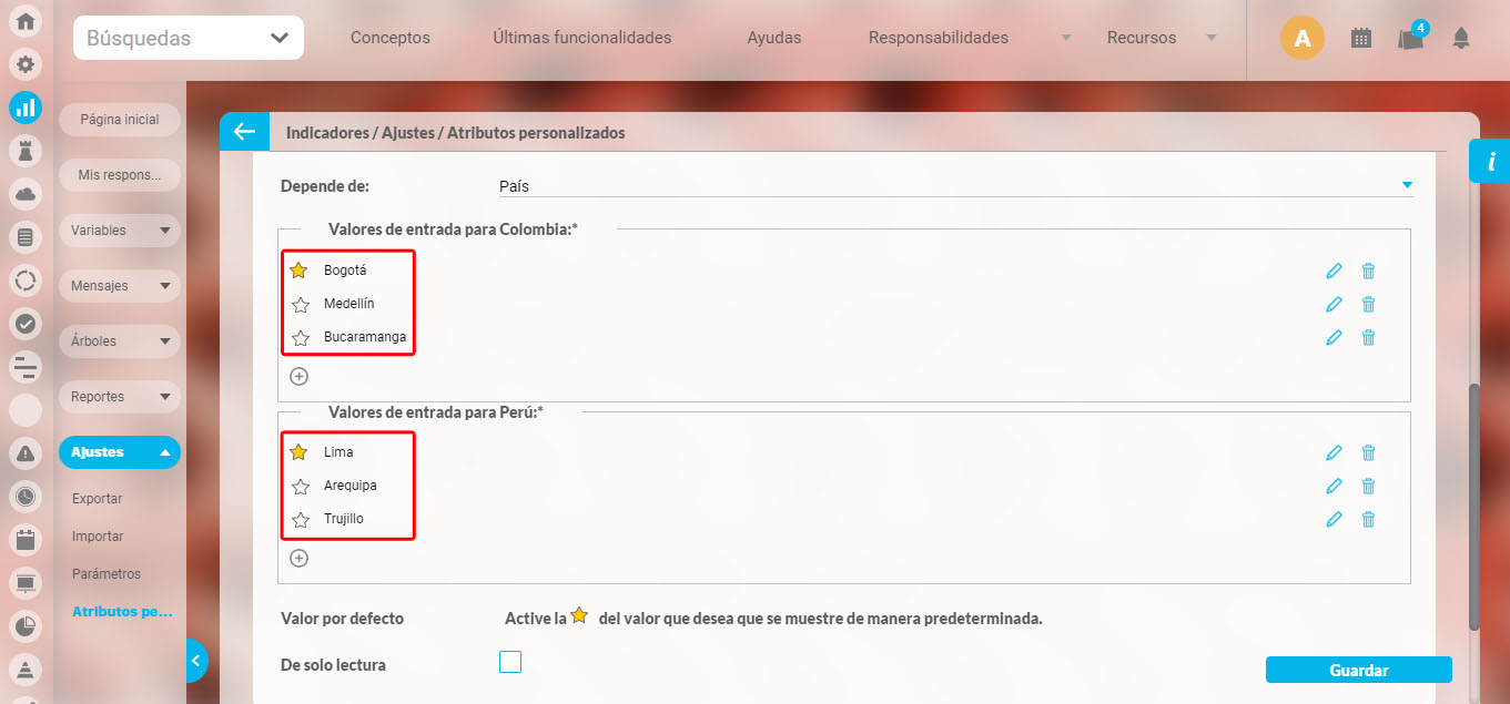 Elija el atributo País en el campo Depende de del atributo Ciudad que está configurando, una vez se elige el atributo para el campo Depende de, el sistema cargará las opciones de ese atributo elegido.