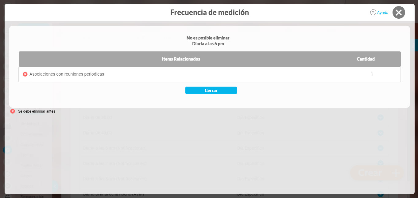 La que se encuentra en el cuadrante rojo simboliza que existe una restricción para eliminar la frecuencia de medición, por lo cual el usuario debe eliminar dicha restricción primero para llevar a cabo la acción que desea. Si la asociación no se puede eliminar la frecuencia de medición tampoco podrá ser eliminado.
