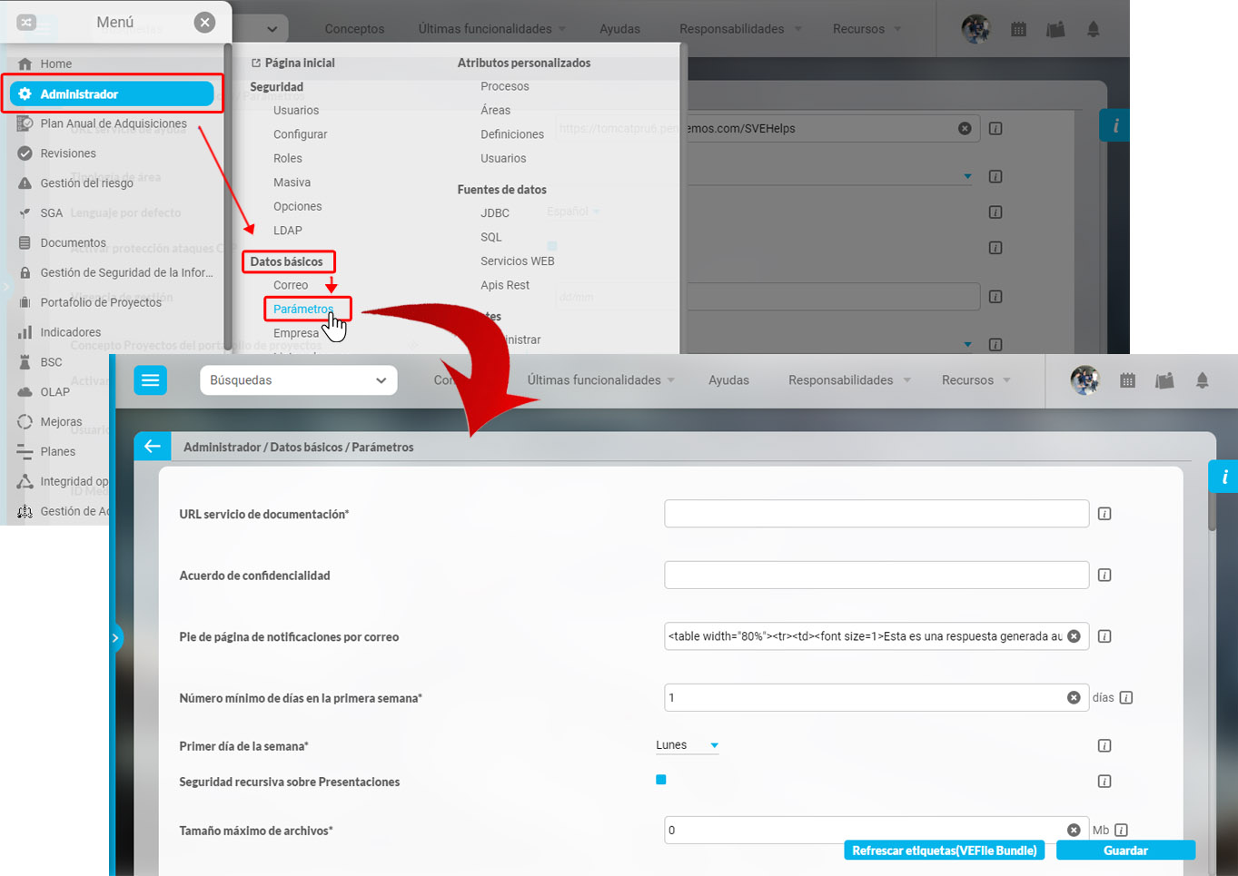 URL Últimas funcionalidades: URL de la WikiSVE. Este parámetro sirve para consultar la documentación de las mejoras y funcionalidades nuevas del producto. Si este parámetro no está bien configurado no podrás ver la información que le ofrece la opción de Últimas funcionalidades, del menú superior.