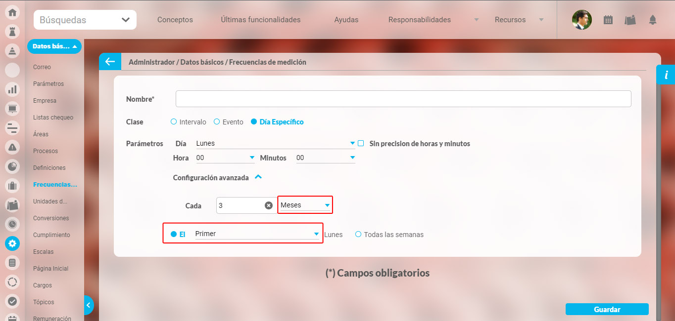 Nombre: Nombre de la frecuencia de medición que está creando. Este campo es importante que sea lo suficientemente descriptivo para evidenciar su funcionalidad a la hora de recurrir a este.