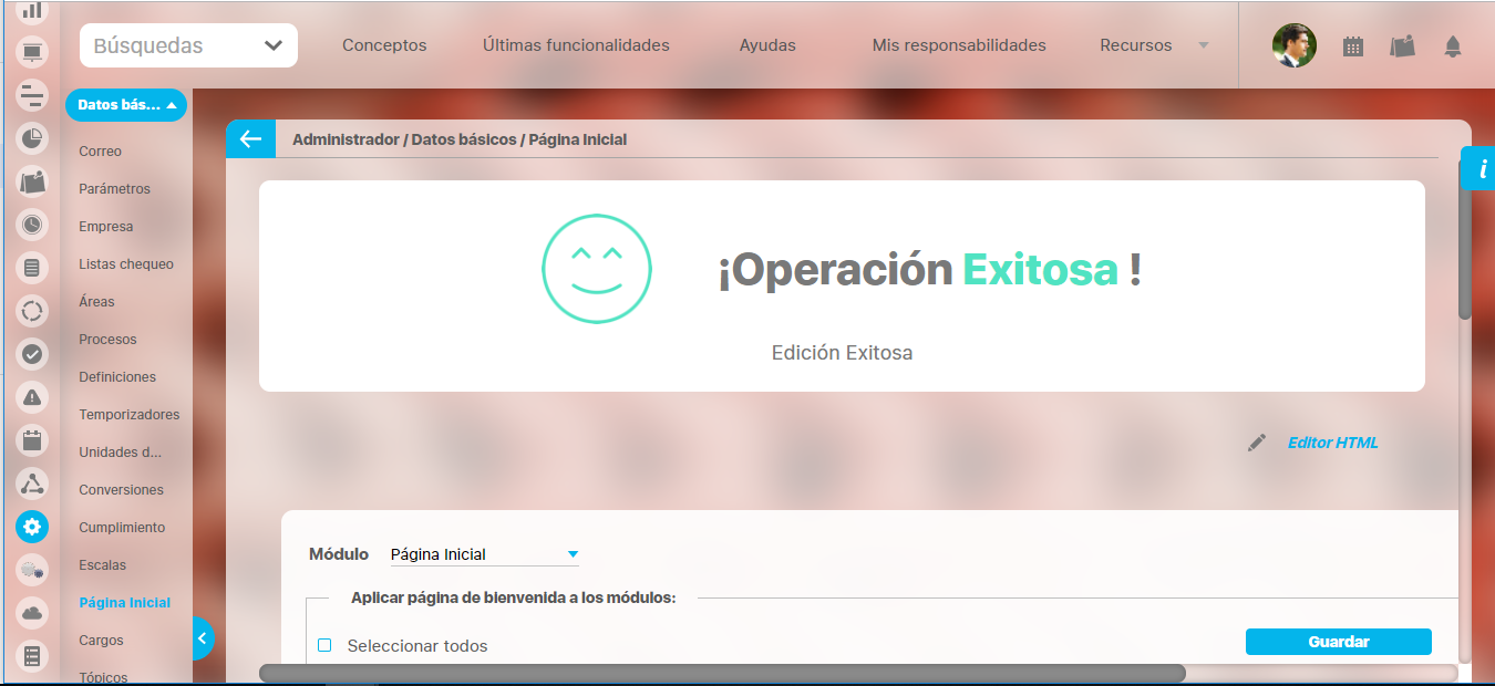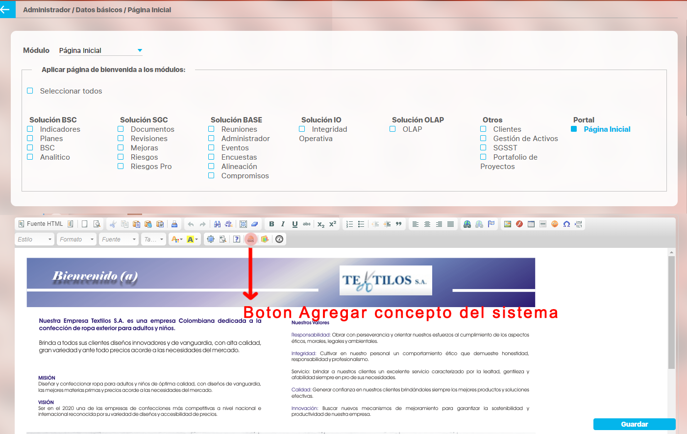 Dentro del editor de creación de la página inicial, es posible agregar vínculos a distintos conceptos presentes en la suite.