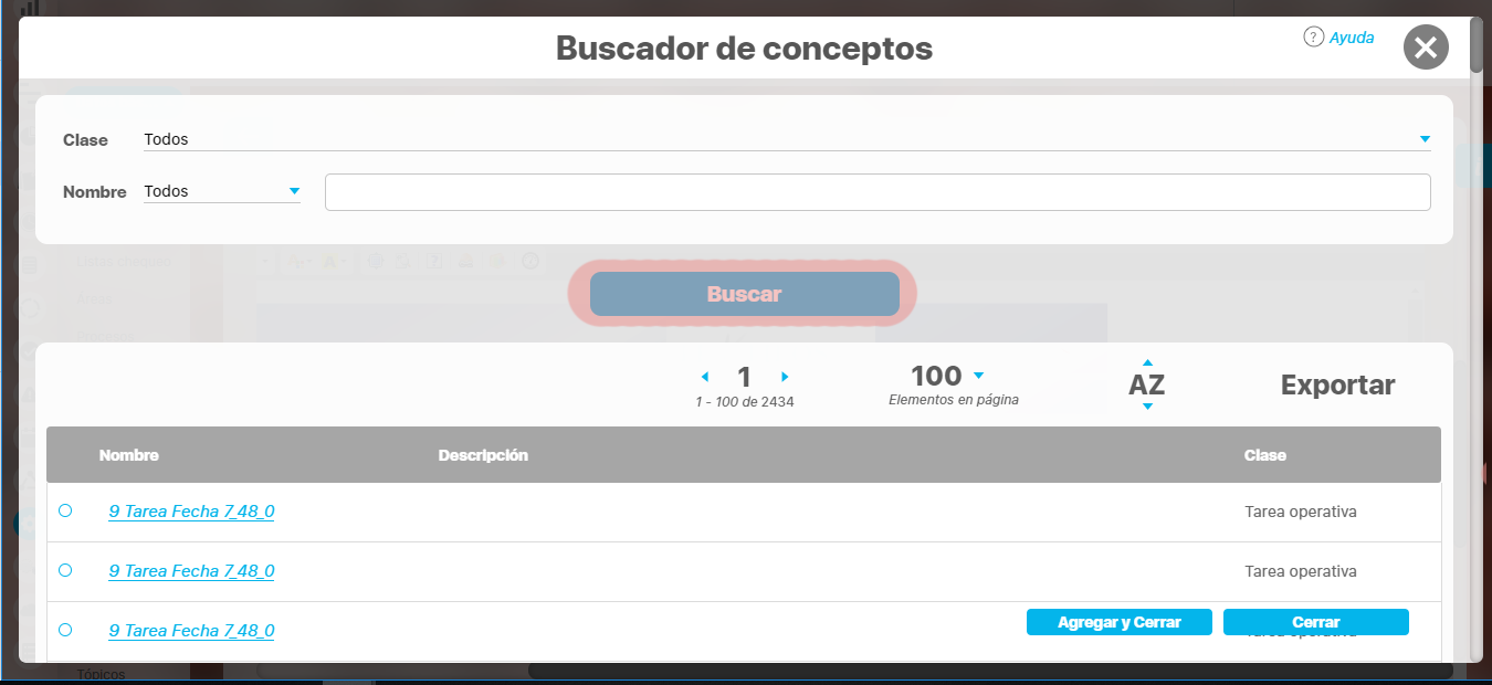 Una vez presionado el botón "Concepto del sistema", se mostrará el buscador de conceptos emergente; en él, la búsqueda podrá realizarse filtrando por clase y por nombre, los resultados se mostrarán en la parte inferior de éste.