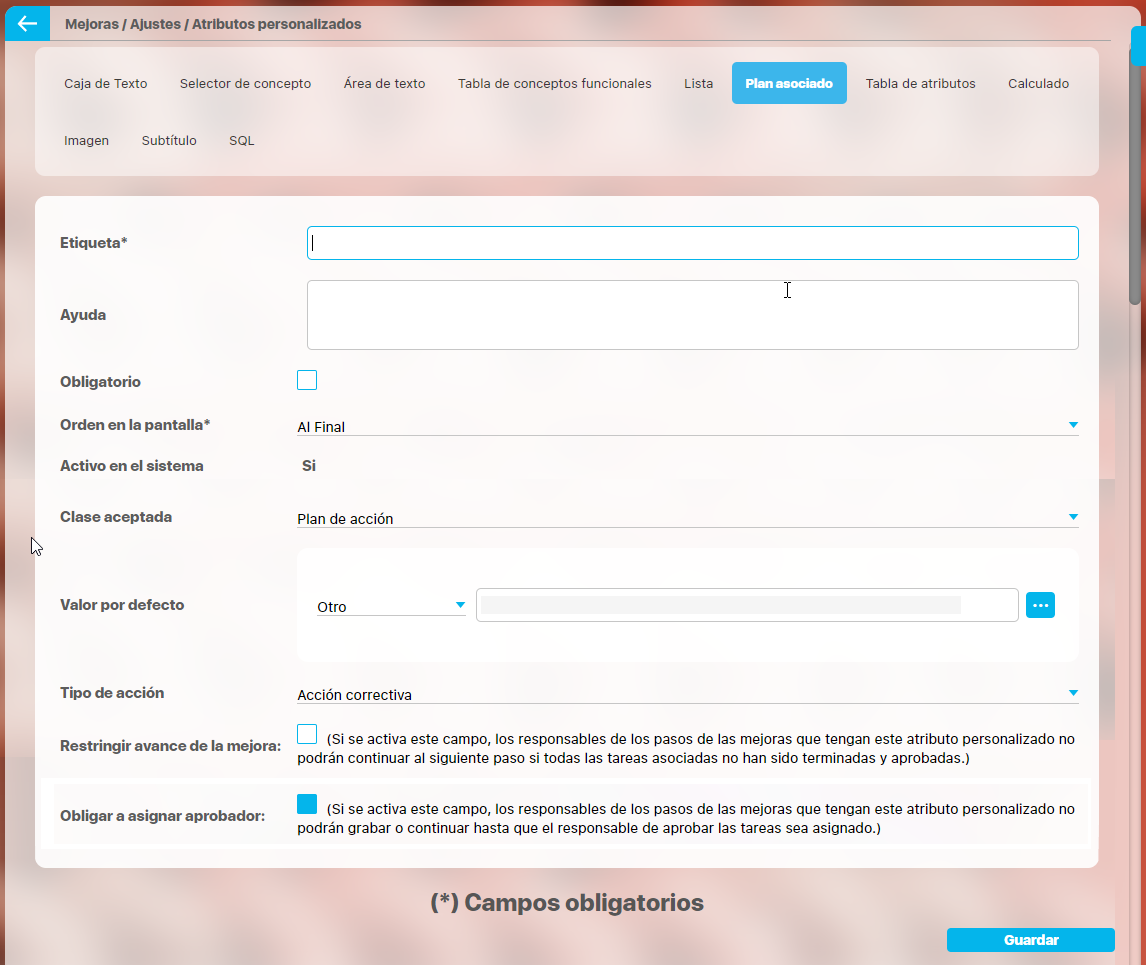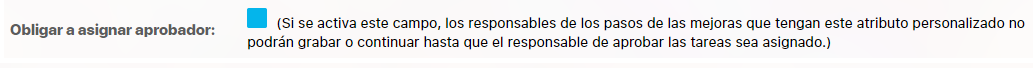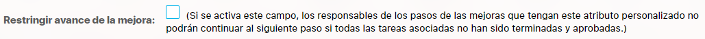Restringir avance de la mejora: Marque esta casilla si requiere que los responsables de los pasos de las mejoras que tengan este atributo personalizado no puedan continuar al siguiente paso si todas las tareas asociadas no han sido terminadas y aprobadas