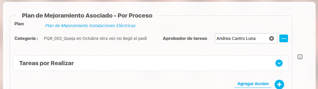 El Aprobador de tareas, podrá ser elegido al solicitar la mejora. Si se deja vacío este campo, el sistema asignará al usuario responsable del plan también como responsable de aprobar las tareas de esa categoría. Si requieres que sea obligatorio asignar el aprobador de tareas entonces debes marcar