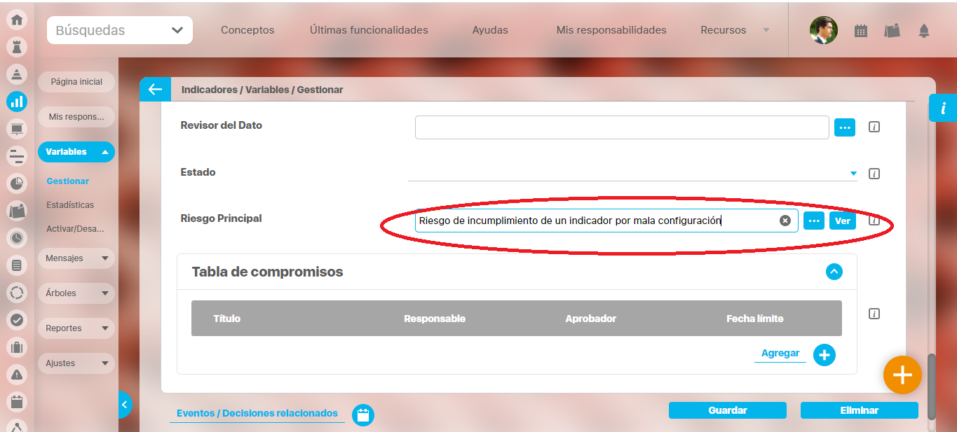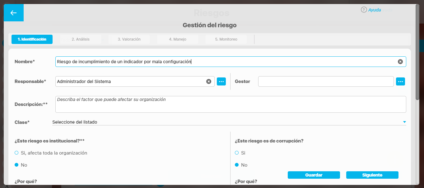 diligencia los datos y Guarda, verás un mensaje de éxito y se cerrará la pantalla de creación para volver a la pantalla de indicadores desde donde estabas asociando el Riesgo: