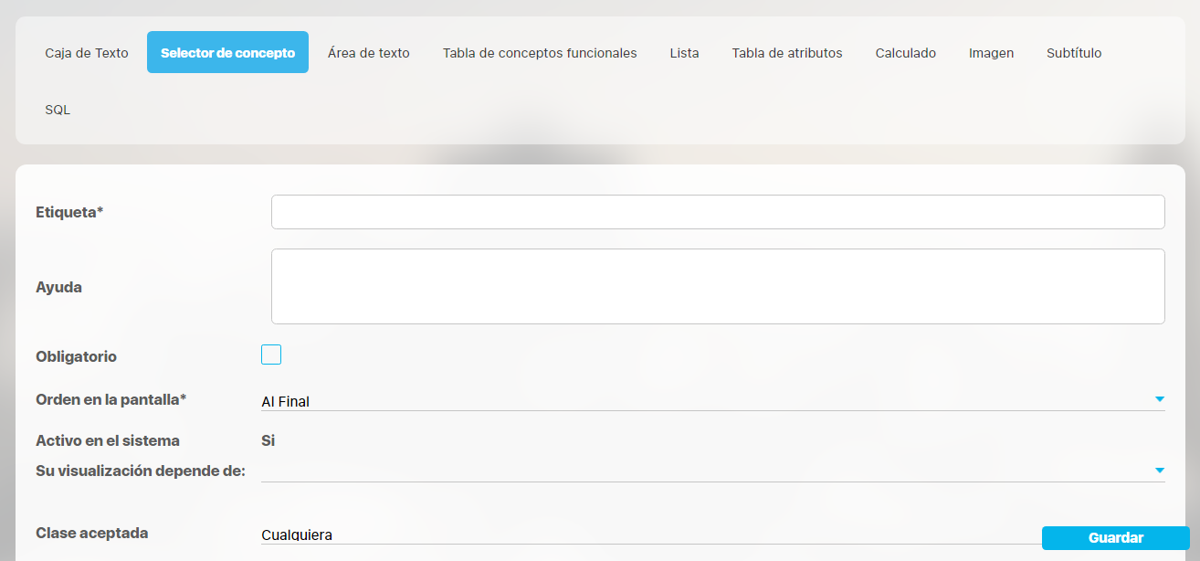 Clase aceptada: Defina el tipo de concepto que el sistema debe permitir que ingrese el usuario en este campo. Sus opciones son: