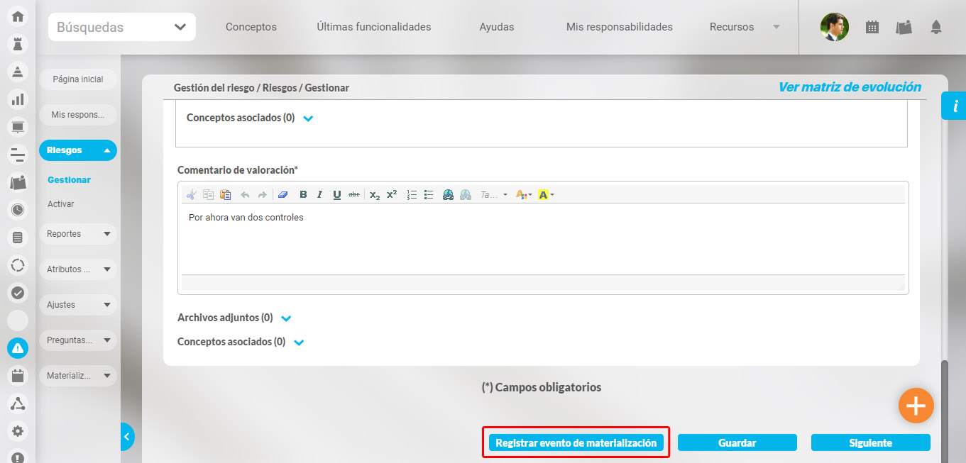 por ejemplo: se va a registrar la materialización de un riesgo y se ha configurado un atributo personalizado de tipo selector de concepto que tiene como clase aceptada la opción mejora. Selecciona el botón "registrar evento de materialización".