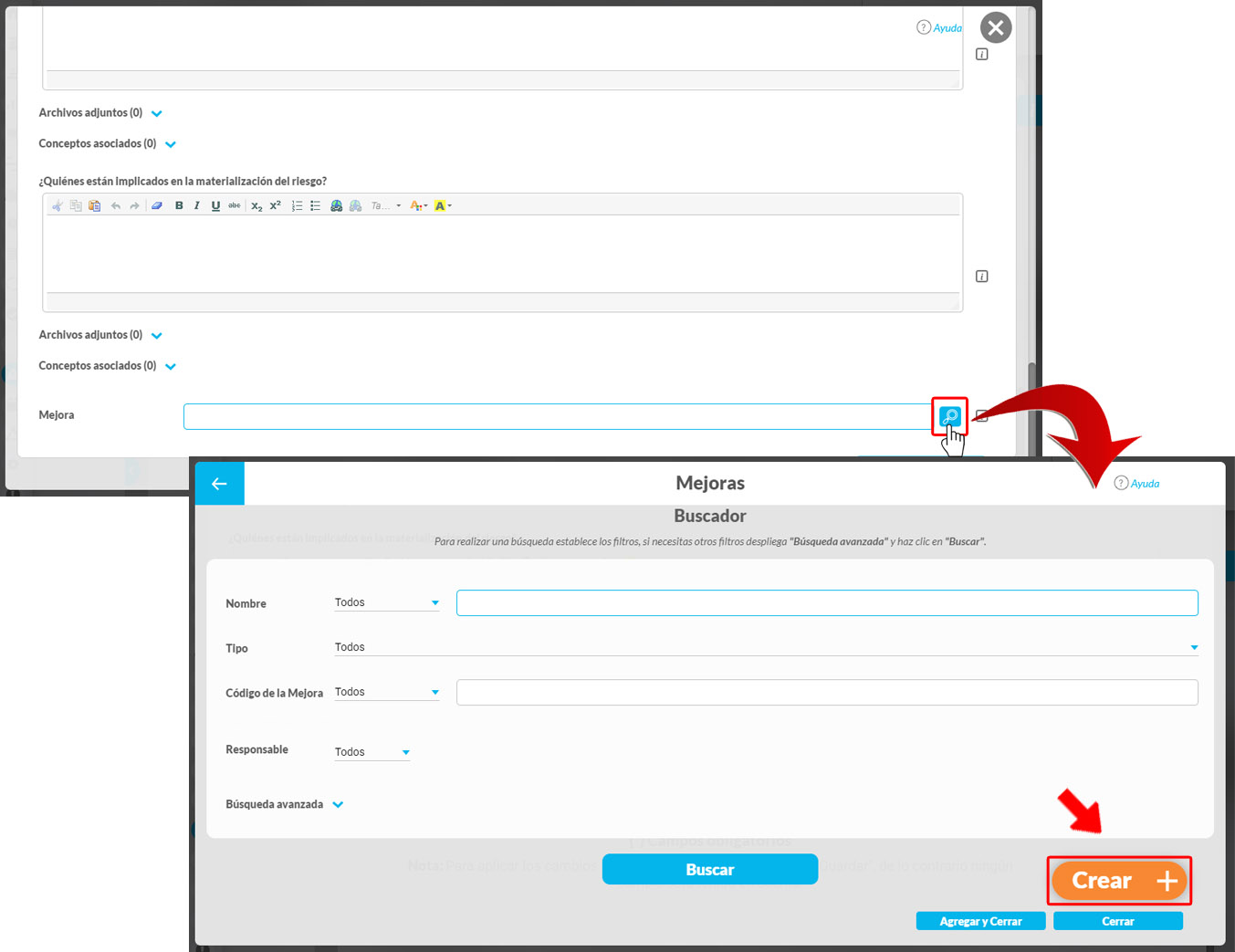 Puedes crear mejora por medio de un atributo personalizado de tipo selector de concepto desde el registro de una materialización, en el atributo personalizado de tipo "selector de concepto" seleccionando la clase aceptada "Mejora", si el usuario en sesión tiene los permisos de crear mejoras al abrir el buscador aparecerá el botón para crear una mejora.