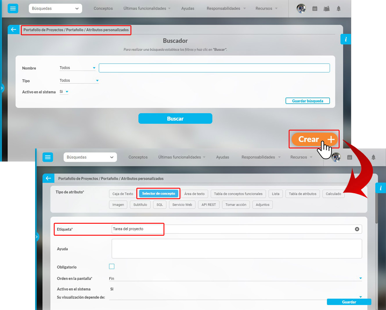 Por ejemplo, ingresáremos al módulo de "portafolio de proyectos" y en el concepto "Portafolio" crearemos un atributo de tipo "Selector de concepto", lo llamaremos "Tarea del Proyecto".