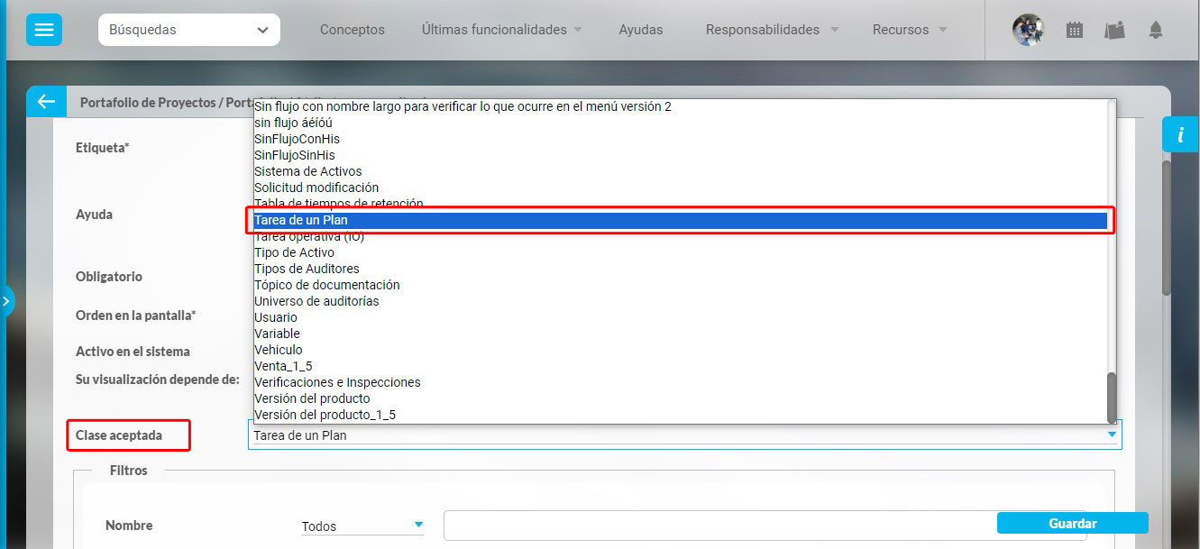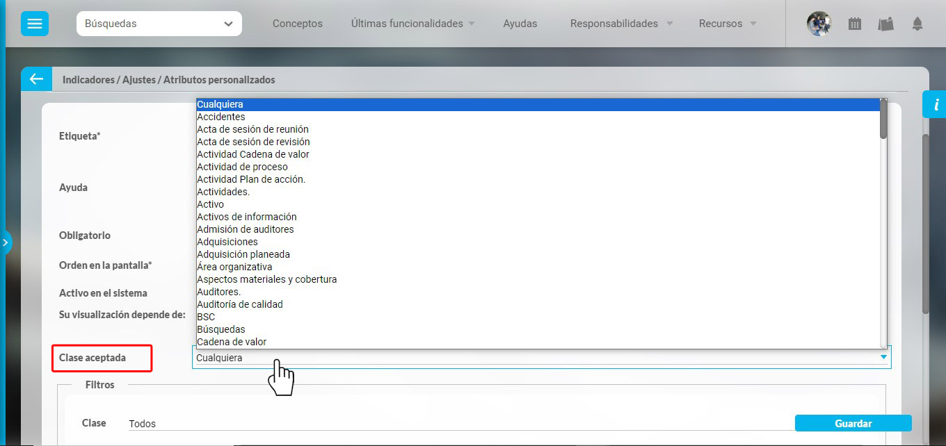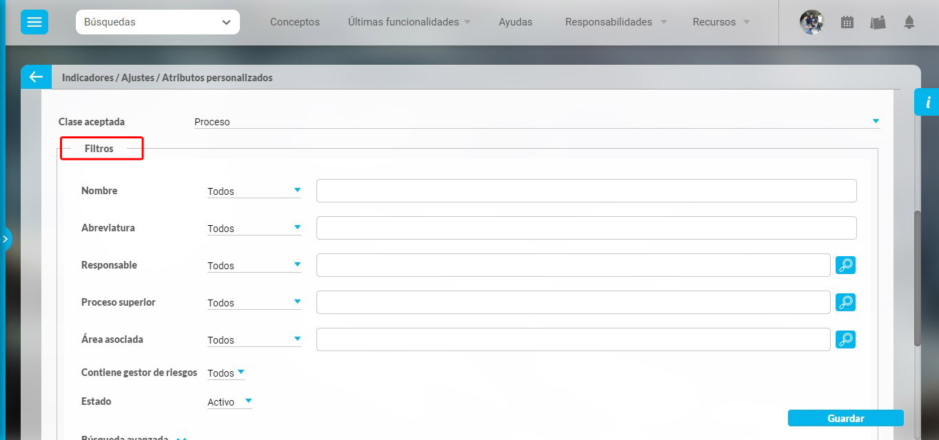Por ejemplo: Si selecciono en clase aceptada el concepto Procesos aparecerán los filtros que corresponden al buscador de procesos. Estos filtros se podrán usar de tal manera que los valores que este atributo mostrará estarán disponibles para el usuario según su configuración.