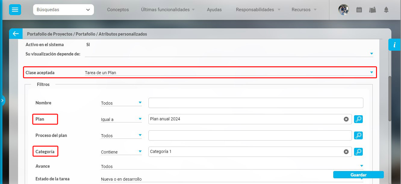 Cuando seleccionamos la "Clase aceptada", el sistema nos muestra un campo de "Filtros" que podemos configurar. Esto nos permite especificar que el sistema nos muestre tareas de un plan en particular en este atributo durante el diligenciamiento. En este caso, configuraremos los filtros "Plan" y "Categoría" para que se muestren tareas de la "Categoría 1" del "Plan anual 2024". Una vez terminemos de configurar el atributo, guardaremos.