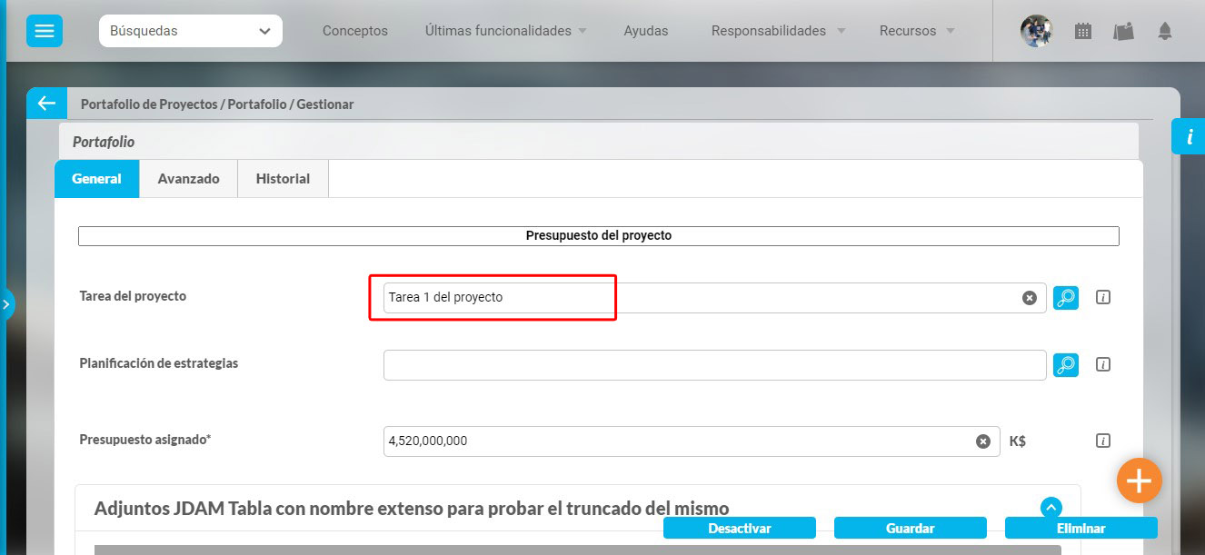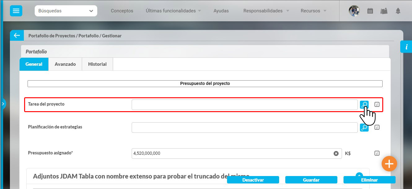 Ahora al ingresar a la edición del proyecto encontraremos el atributo que creamos anteriormente llamado "Tarea del proyecto", seleccionaremos el botón para buscar como se muestra en la siguiente imagen.