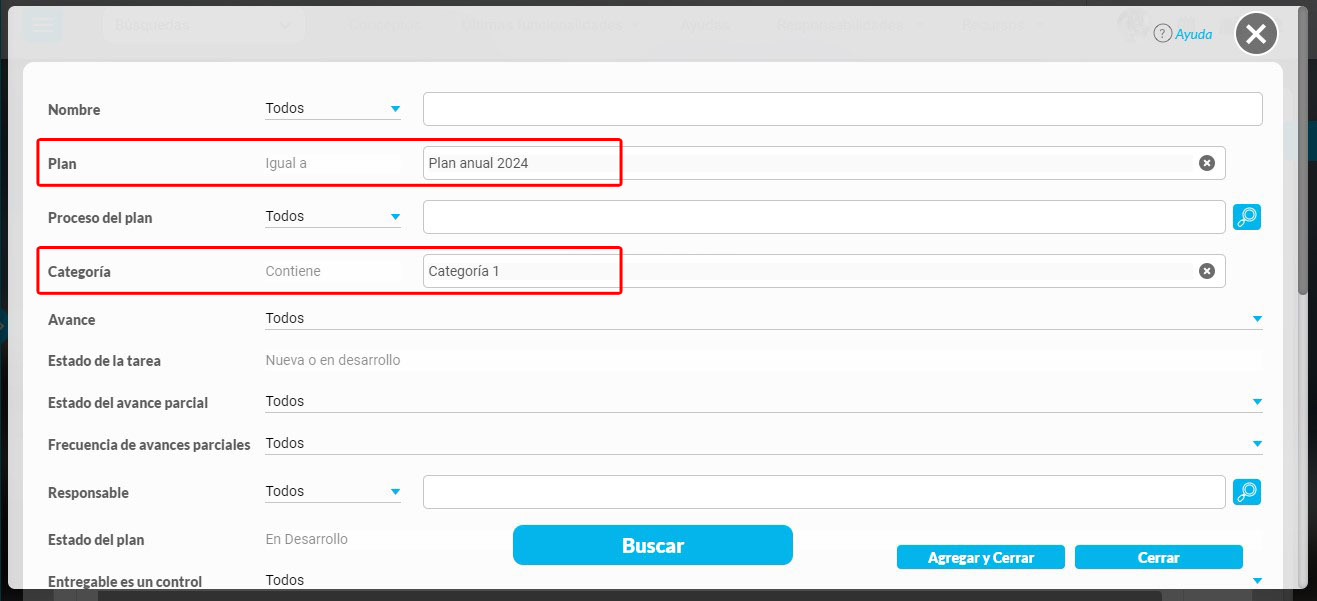 En esta ventana encontraremos de solo lectura los filtros que definimos en el atributo, al seleccionar el buscar se mostrarán las tareas que pertenecen a la categoria del plan que se definió en los filtros.