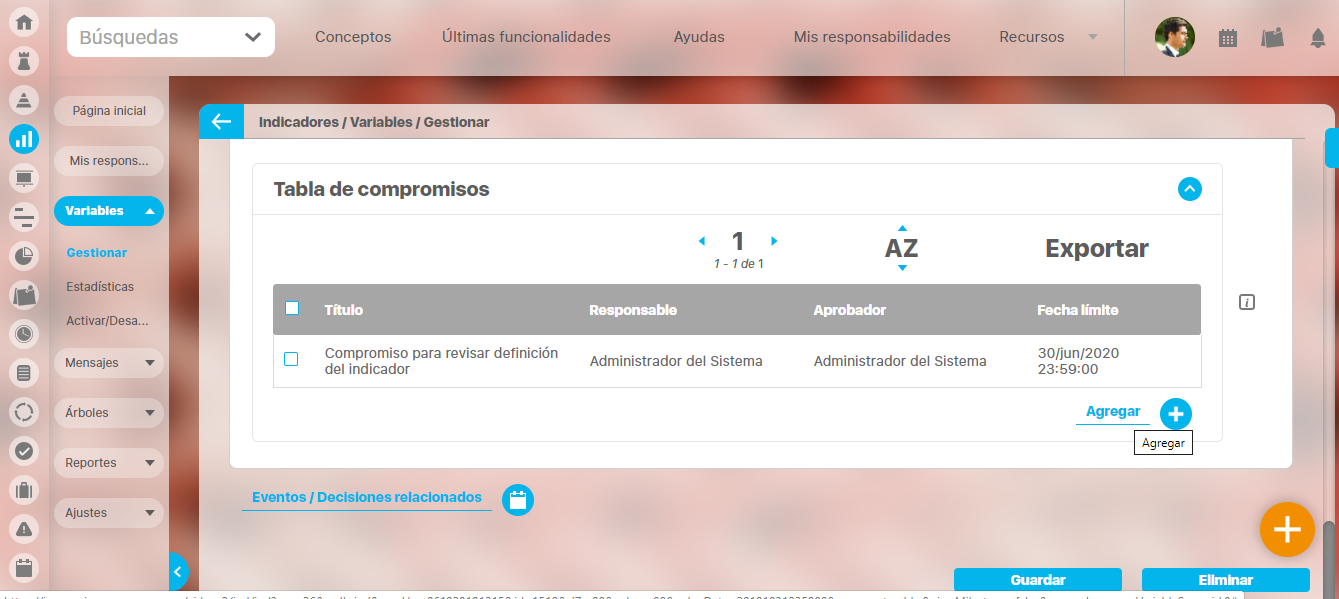 En el módulo de indicadores se creó un atributo personalizado que permite asociar una tabla de compromisos a cada variable. Al utilizar este Atributo, si el usuario que diligencia el atributo personalizado además tiene permisos para crear Compromisos, entonces verá en la parte inferior derecha de la pantalla el botón para crear un Compromiso nuevo: