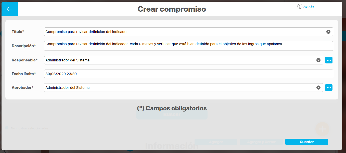 diligencia los datos y Guarda, verás un mensaje de éxito y se cerrará la pantalla de creación para volver a la pantalla de indicadores desde donde estabas asociando el Compromiso: