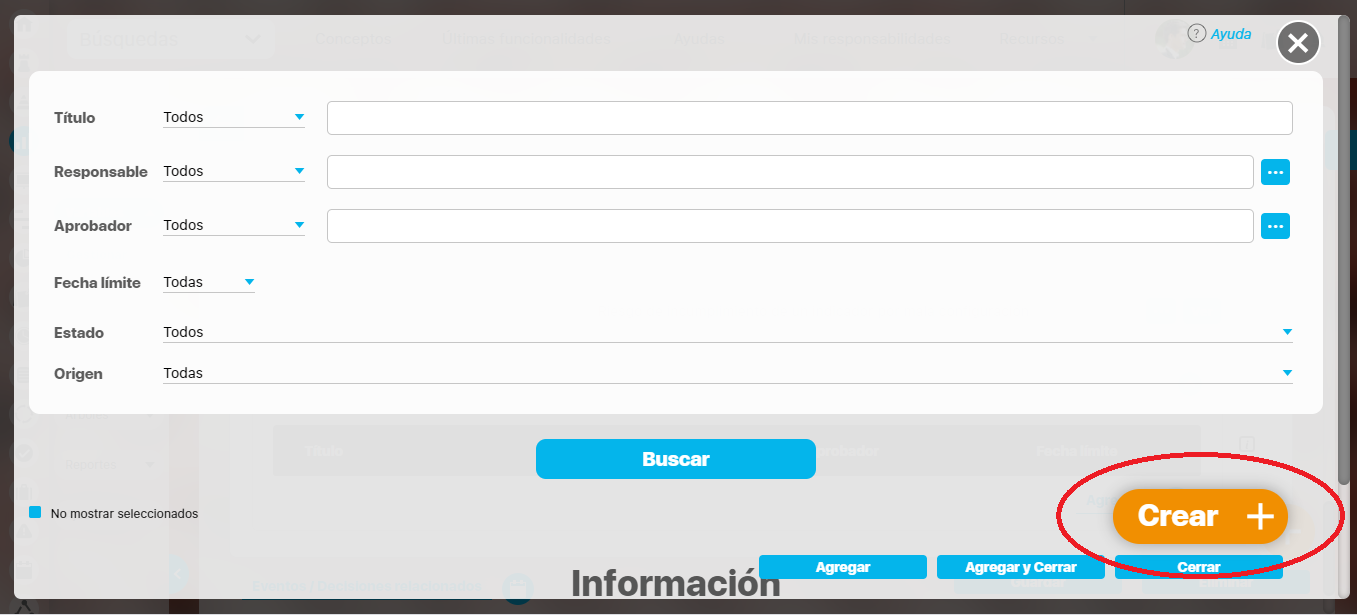 Al utilizar un atributo tipo tabla de conceptos de las clases específicas VARIABLES, RIESGOS, COMPROMISOS O CONCEPTOS PERSONALIZADOS (sea un concepto con flujo o sin flujo) y siempre y cuando el usuario que esté utilizando el Atributo tenga permisos de crear Variables, Riesgos, Compromisos o el concepto personalizados entonces al ingresar al buscador del concepto tendrá disponible el botón crear que le permitirá crear el concepto que quiere asociar y volver al Atributo asociando el concepto recién creado.