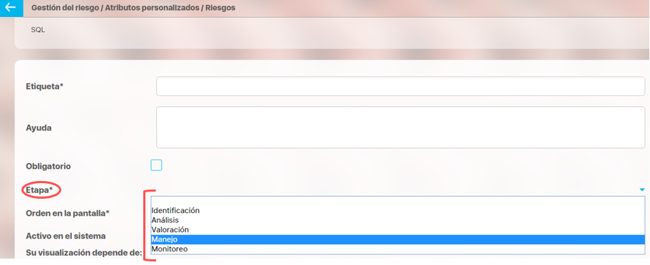 Etapa: Debe seleccionar de la lista de los pasos de riesgos en cual de esos pasos va a aparecer el atributo personalizado que se está creando.