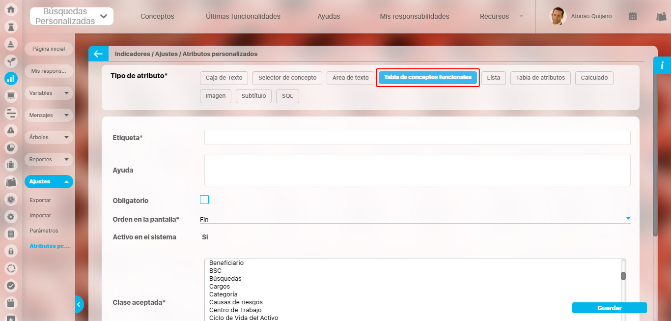 Este atributo tabla de conceptos funcionales y el atributo selector de concepto acepta en la clase el concepto: cargos, de la opción datos básicos del módulo administrador.