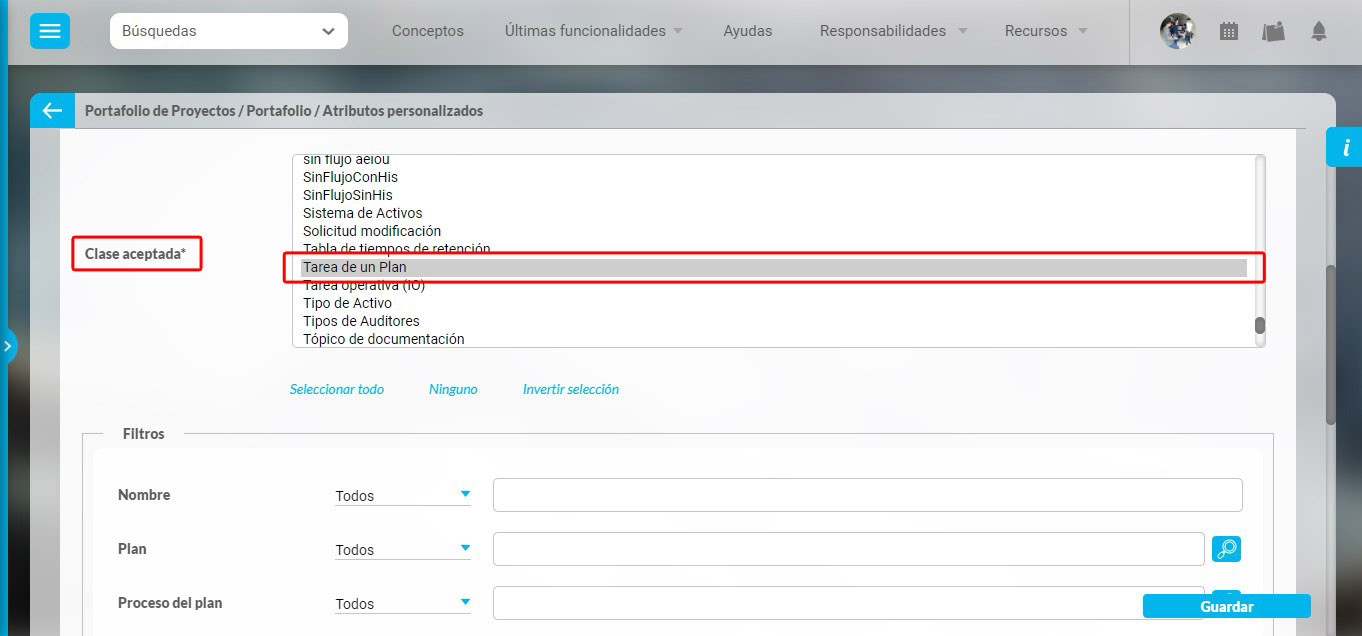 En la opción "Clase aceptada" seleccionaremos "Tarea de un plan".