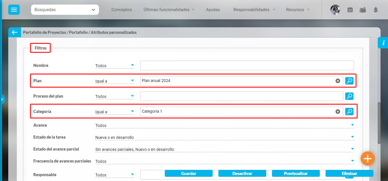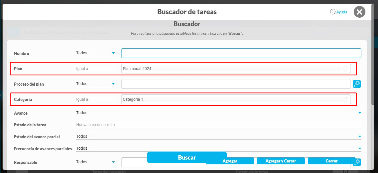 En esta ventana encontraremos de solo lectura los filtros que definimos en el atributo, al seleccionar el buscar se mostrarán las tareas que pertenecen a la categoria del plan que se definió en los filtros.