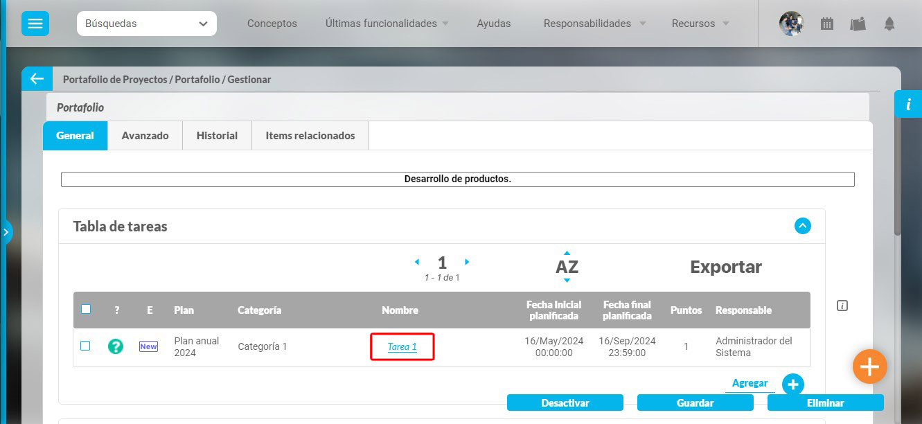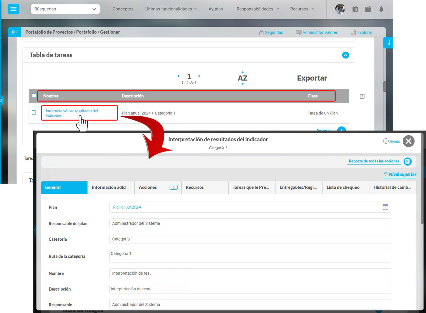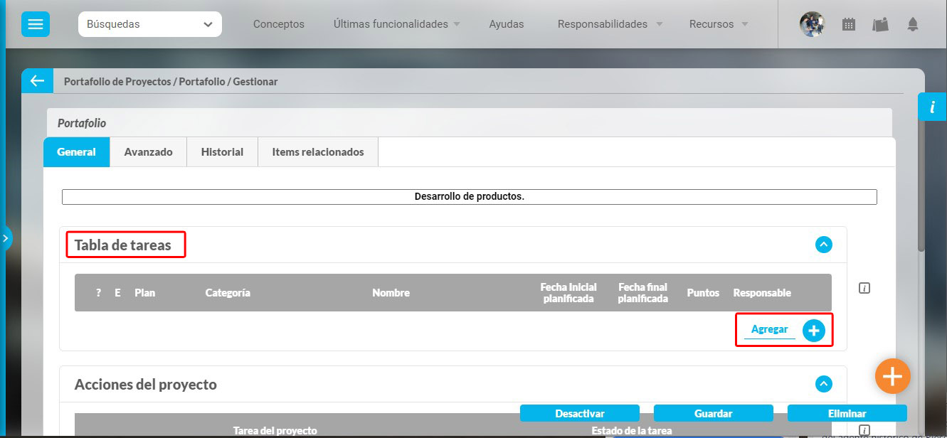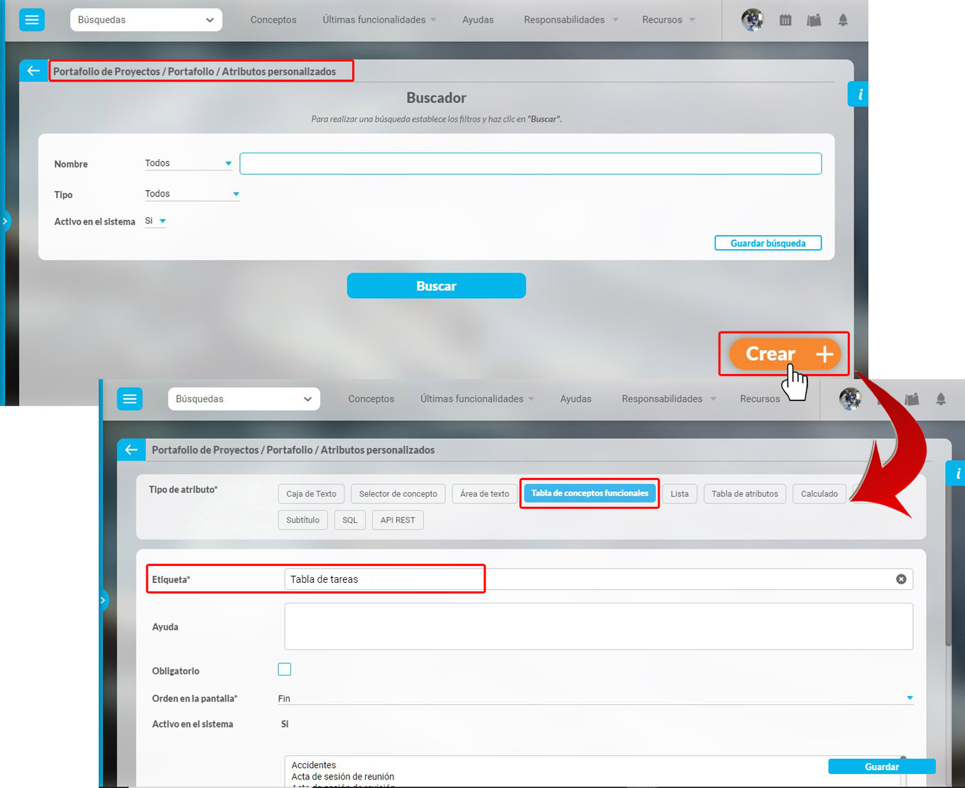 Por ejemplo, ingresáremos al módulo de "Portafolio de proyectos" y en el concepto "Portafolio" crearemos un atributo de tipo "Tabla de conceptos funcionales", lo llamaremos "Tabla de tareas".