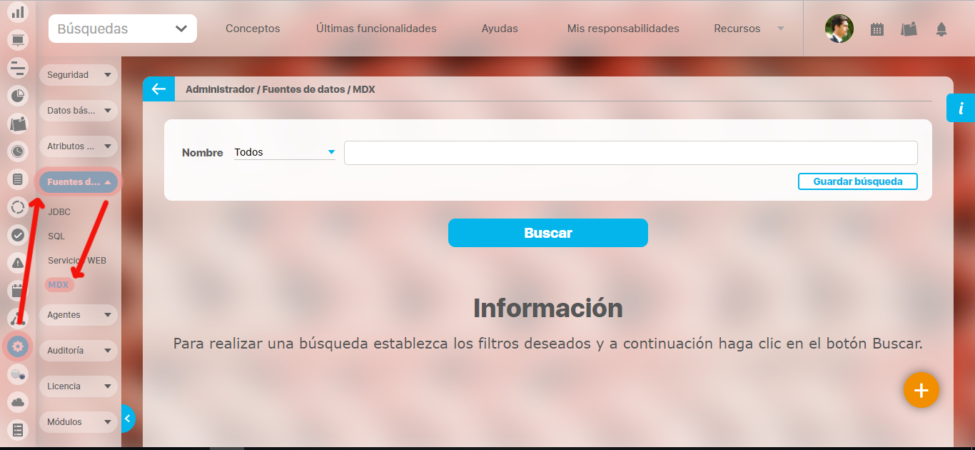 Haga clic en la opción "Consultas MDX" del menú lateral Fuentes de datos externas, aparece la siguiente pantalla donde encuentra los diferentes criterios de búsqueda.