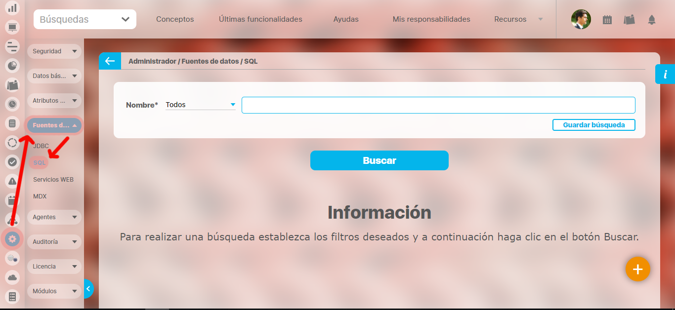 Haga clic en la opción "Consultas SQL" del menú lateral Fuentes de datos externas. Aparece la siguiente pantalla donde encuentra los diferentes criterios de búsqueda.