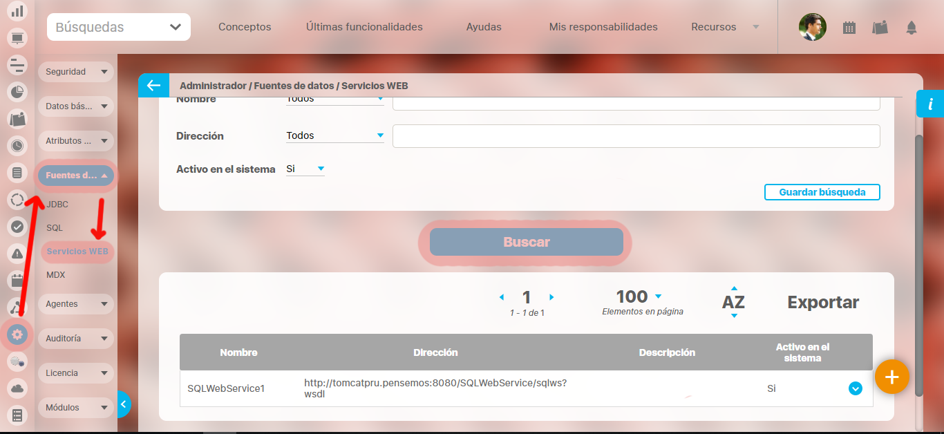 Haga clic en la opción "Servicio Web" del menú lateral Fuentes externas.