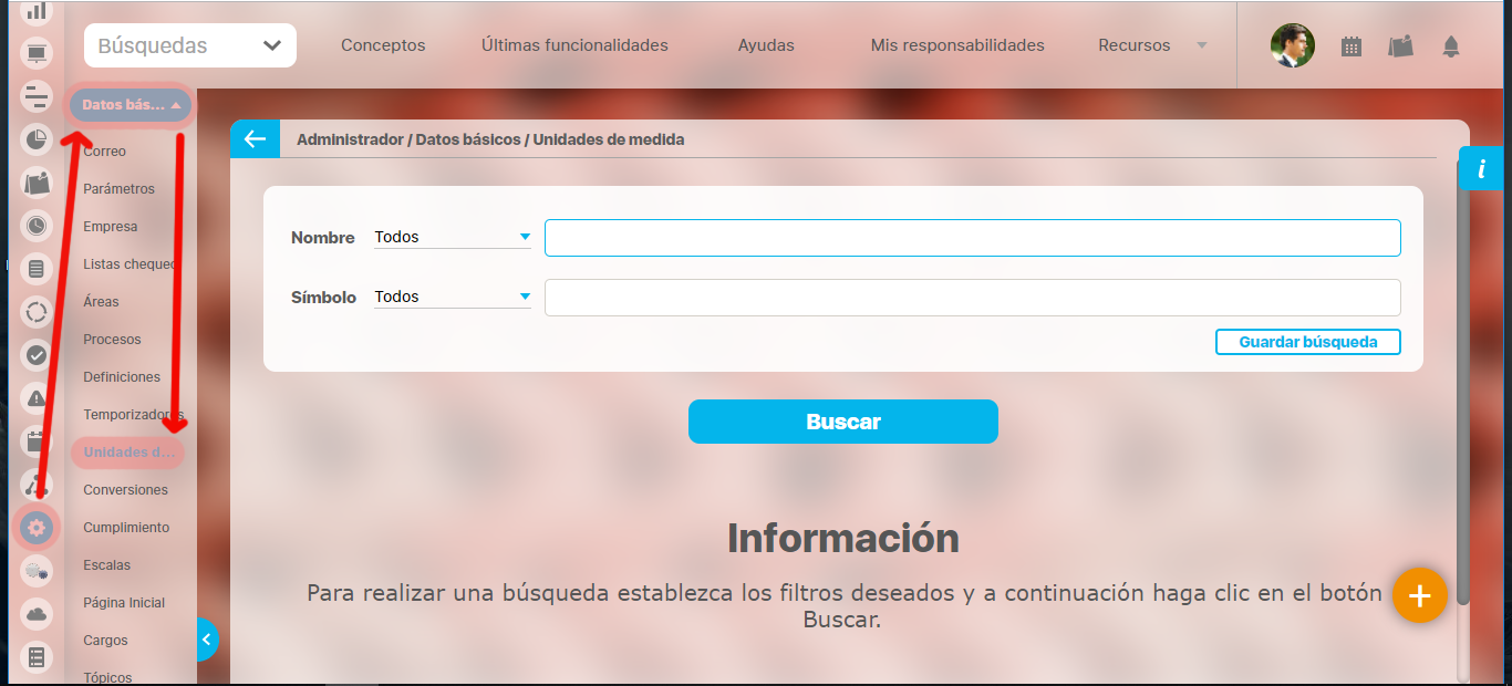 Haga clic en la opción "Unidad de medida" del menú lateral Datos Básicos aparecera la siguiente pantalla donde encuentra los diferentes criterios de búsqueda.
