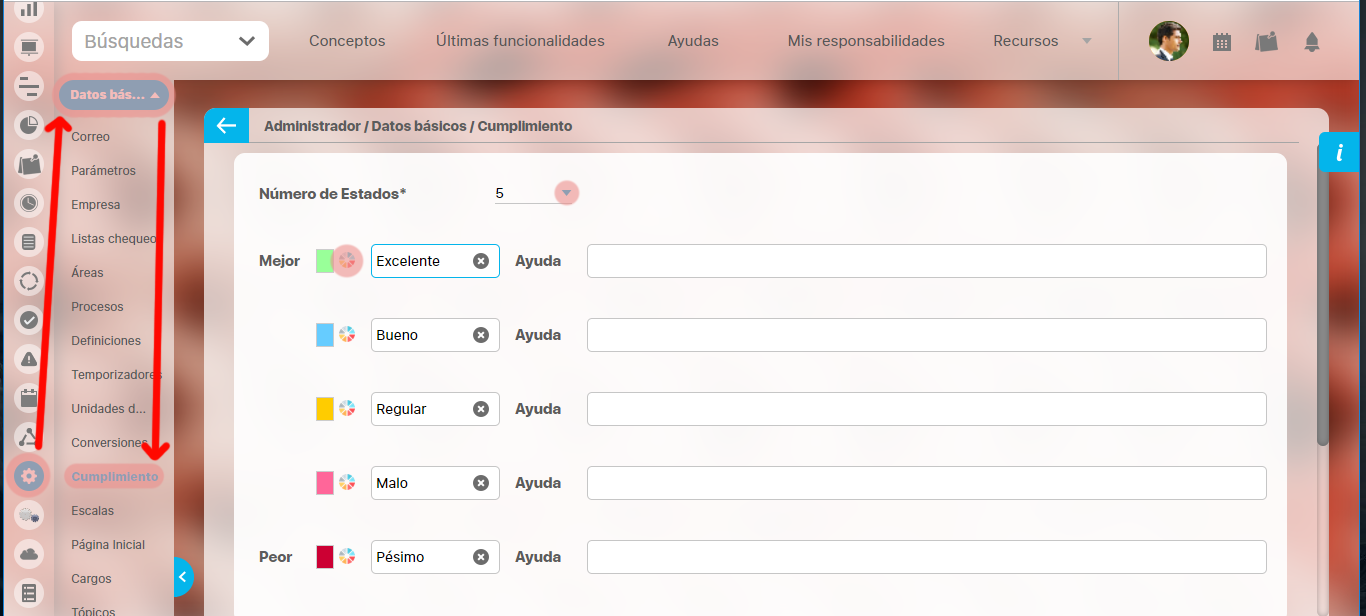 Para crear o editar un estado selecciona del menú lateral la opción Datos básicos , y da clic en Cumplimiento, aparecerá la siguiente pantalla en el área de trabajo.