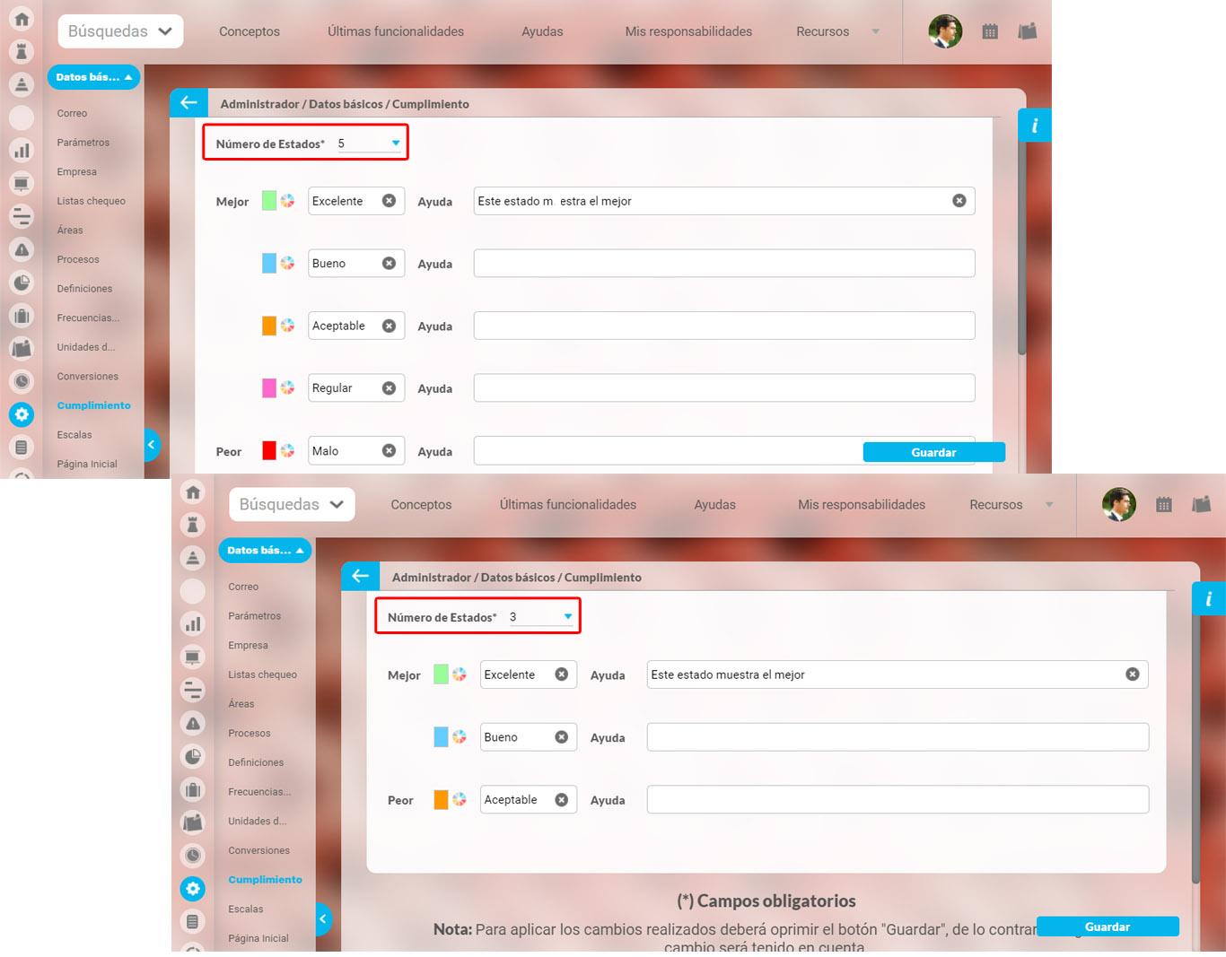 NOTA: Si cambias los colores o nombres de algún estado al guardar podrás ver inmediatamente los nuevos colores o nombres de los estados en los lugares en que se vea el estado de cumplimiento de los indicadores afectados y en la gráfica histórica los colores nuevos se verán en todas las fechas pasadas y futuras.