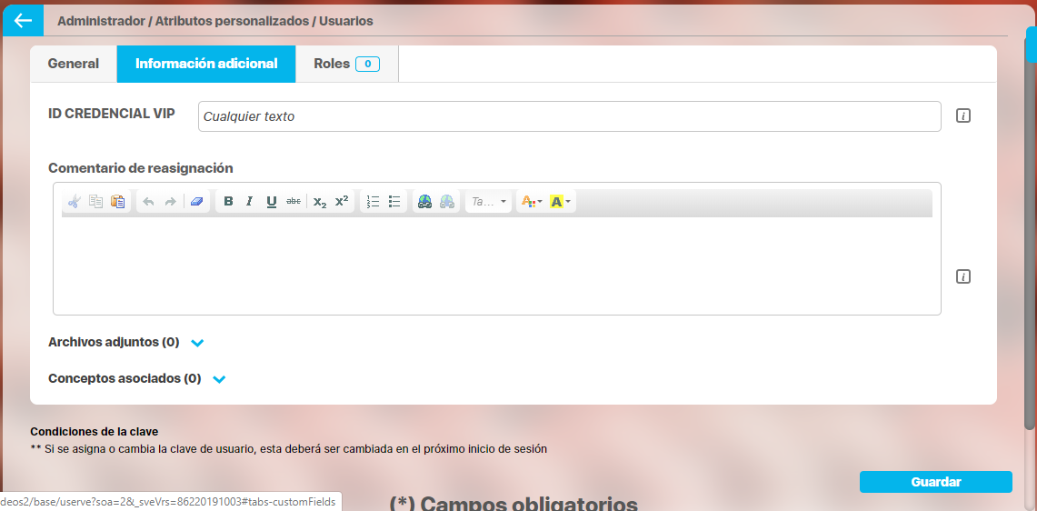 En esta pestaña aparecen todos los atributos personalizados activos que se hayan configurado para el concepto usuario.