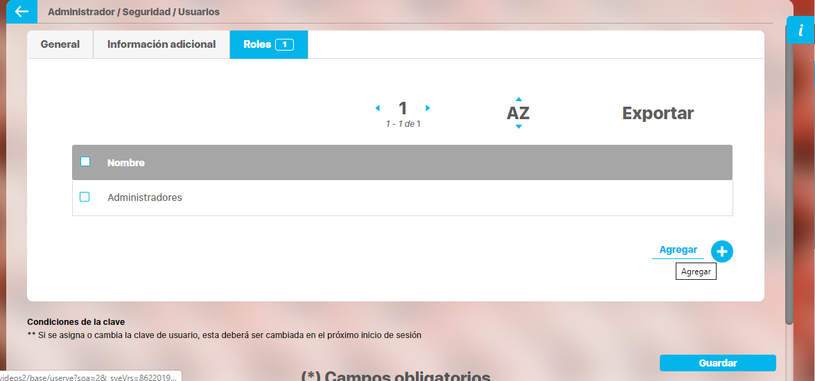 Cambiar clave próximo inicio de sesión: En este campo se indica si se obliga o no, a realizar el cambio de clave por parte del usuario. Al ser usuario nuevo este campo por defecto será SI.