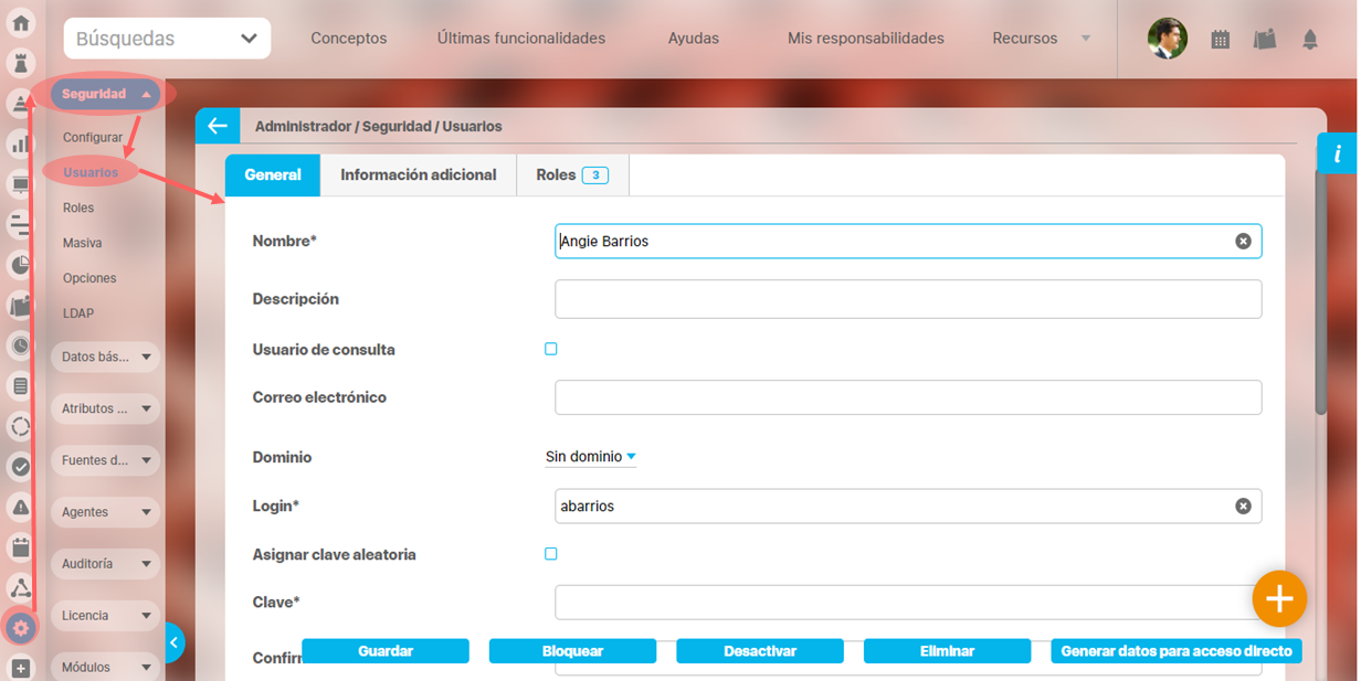 Crea un nuevo usuario, desde Usuarios en la sección Seguridad del menú del Administrador.