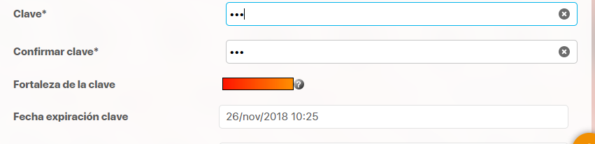 Fortaleza de la clave: Este indicador gráfico permite medir el nivel de seguridad de las contraseñas mediante un recuadro de color, en el que el rojo representa bajo nivel de seguridad, amarillo nivel medio y verde alto nivel. Para conocer las políticas de evaluación podrá dar clic en el ícono de interrogación ubicado a la derecha de este campo.