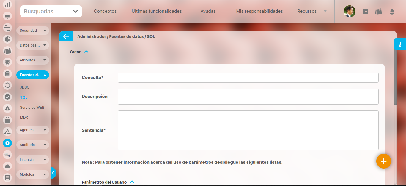 En el campo "Sentencia" ingrese la consulta SQL. Ésta puede contener parámetros de usuario que deberán ser ingresados al utilizar esta consulta. Además se encuentran disponibles parámetros del Sistema para el manejo de fechas.