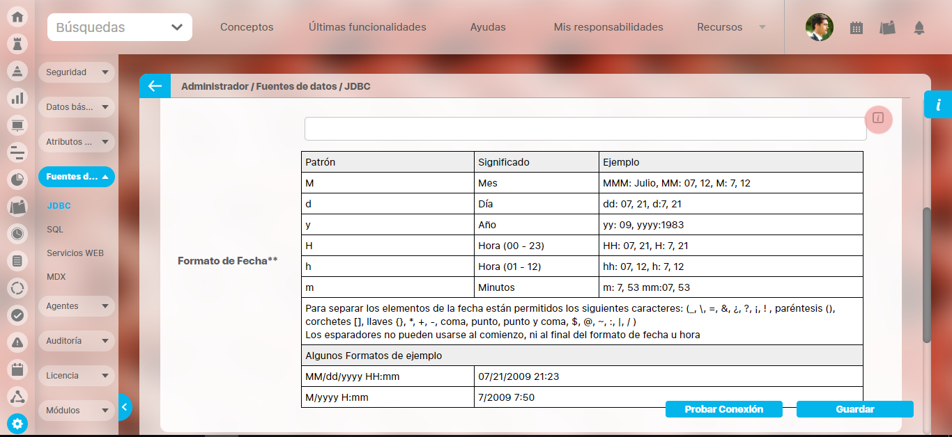 Ingrese el formato de las fechas empleado en la fuente de datos externa, para la correcta realización de las consultas. Se debe indicar primero el formato de la fecha y luego el formato de la hora; siempre debe haber un espacio entre los dos formatos. Para consultar información detallada podrá hacer clic en el ícono de ayuda ubicado a la derecha del campo.