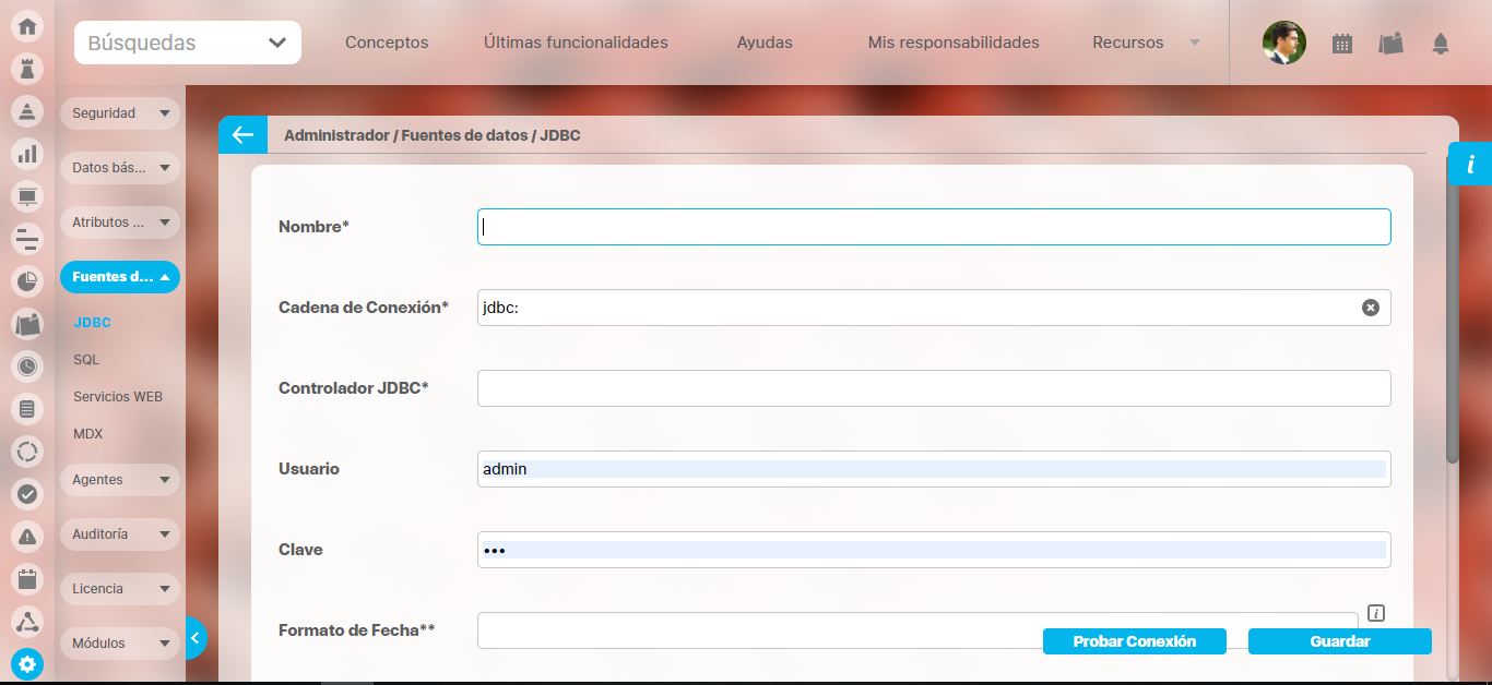 La Suite VISIÓN EMPRESARIAL® permite establecer conexión a fuentes de datos externas a través de controladores JDBC (Java Database Connectivity), por lo tanto, es necesario contar con el controlador específico para el proveedor de la base de datos externa. Para configurar la conexión con una fuente de datos externa siga los siguientes pasos: