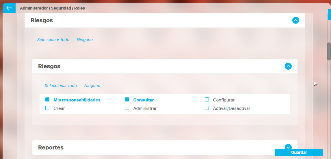 Todos los módulos de SVE disponibles en tu empresa, aparecen en un menú colapsado. Para seleccionar las opciones a las que los usuarios pertenecientes al rol tendrán derecho, has clic sobre cada módulo y se desplegará el listado de opciones. Marca las opciones deseadas. Para una selección rápida has uso de "Seleccionar todo" o "Ninguno", como se muestra en la siguiente imagen.