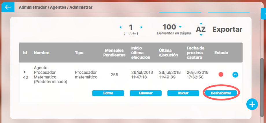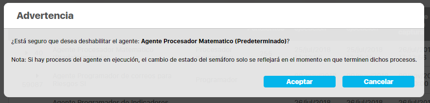 Has clic en Deshabilitar para que el agente no se pueda usar, esto quiere decir que no se ejecutará al llegar la fecha de próxima captura ni se puede iniciar manualmente. Podrás editar y eliminar el agente deshabilitado. El siguiente mensaje aparece si deshabilitas un procesador matemática como muestra el ejemplo