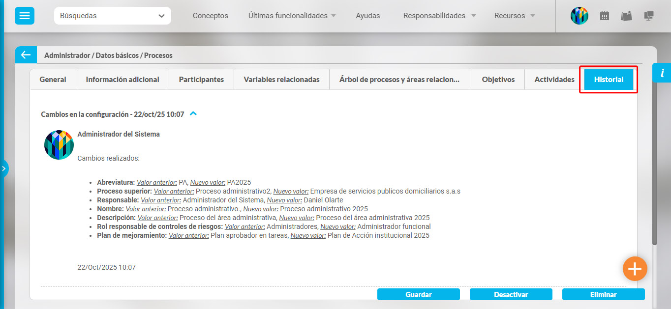 El historial permite registrar de forma automática todas las modificaciones realizadas en las pestañas General, Participantes o variables relacionadas, garantizando la trazabilidad y facilitando la auditoría del sistema.