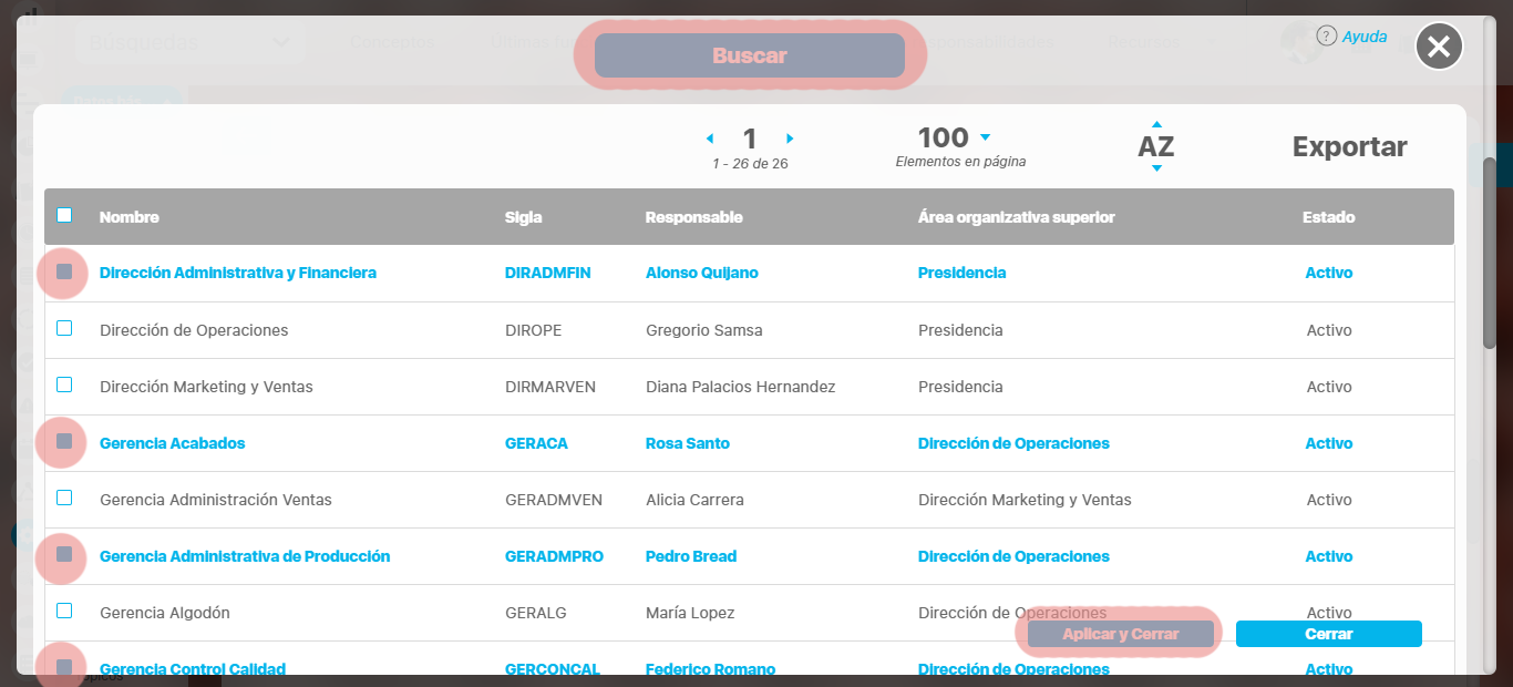 Se pueden asociar más áreas al proceso que está siendo editado, haciendo clic sobre él. Se mostrará el siguiente recuadro que le permitirá elegir las áreas que desea asociar a un proceso como también desmarcar las que desea desasociar.