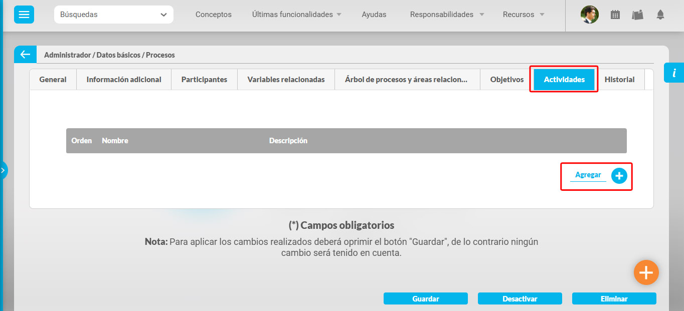 Una vez se encuentra en la pantalla de edición del proceso dé clic en el botón Agregar de la sección Actividades.