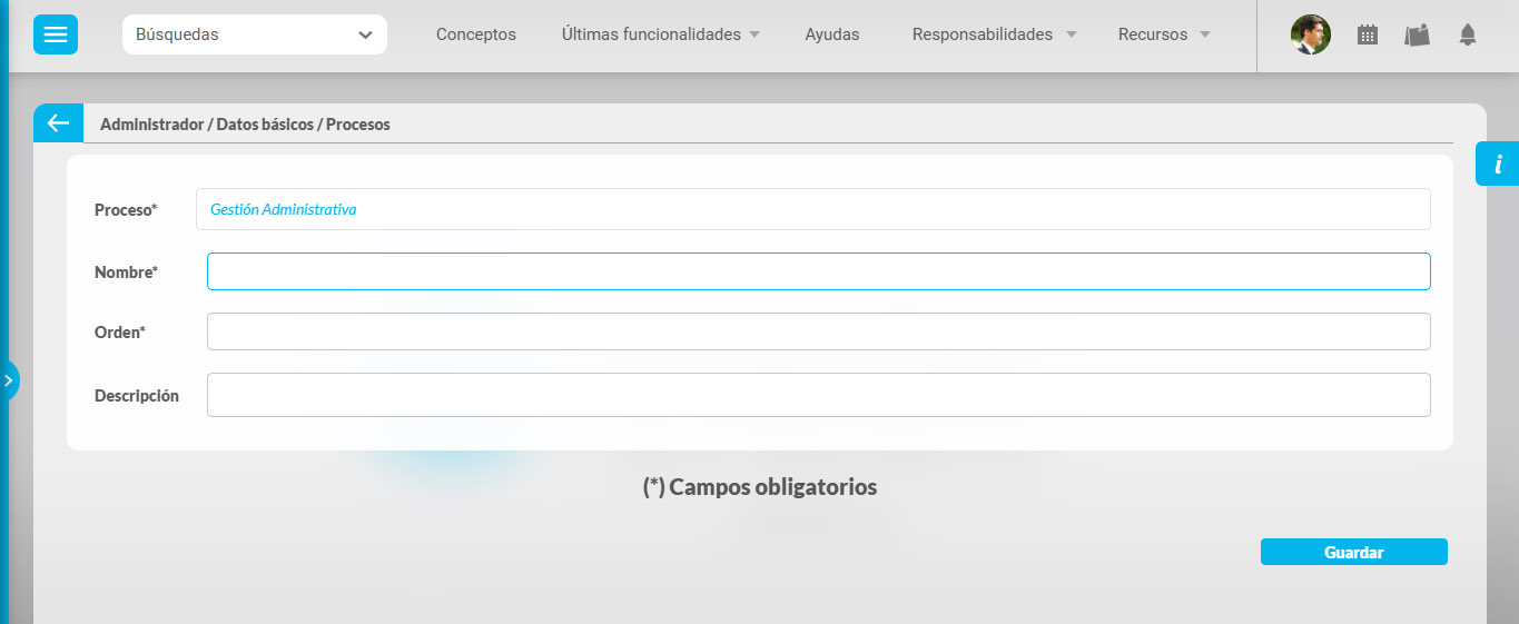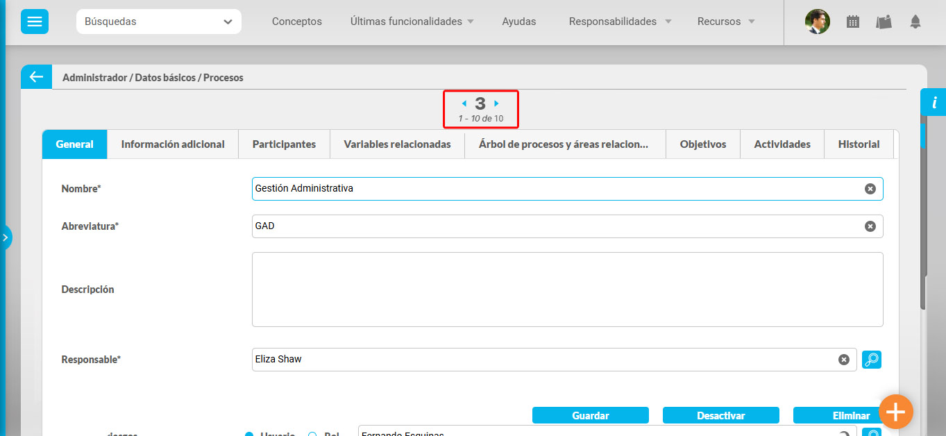 Se muestra la pantalla de edición del proceso con sus datos básicos, que el usuario puede modificar. Puedes utilizar el elemento de la parte superior para pasar de uno en uno los resultados de una busqueda.